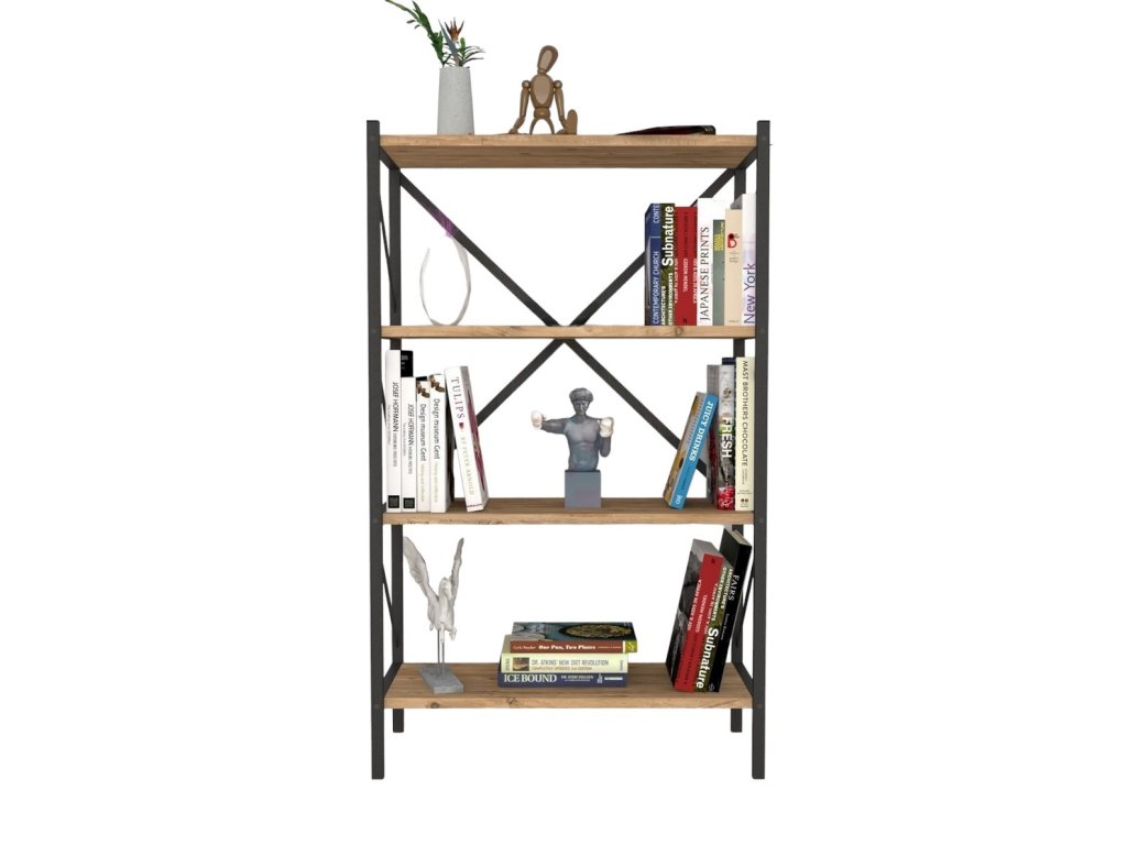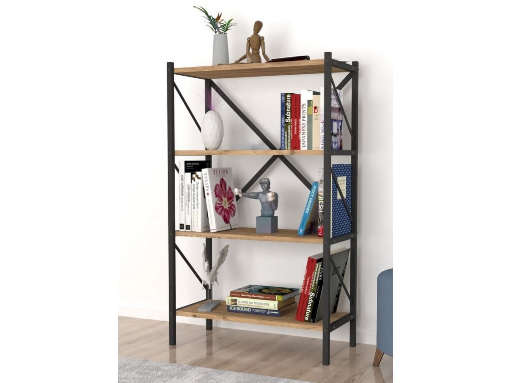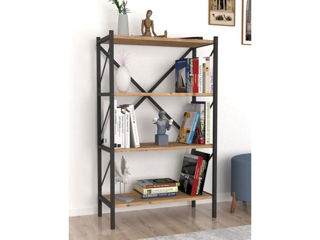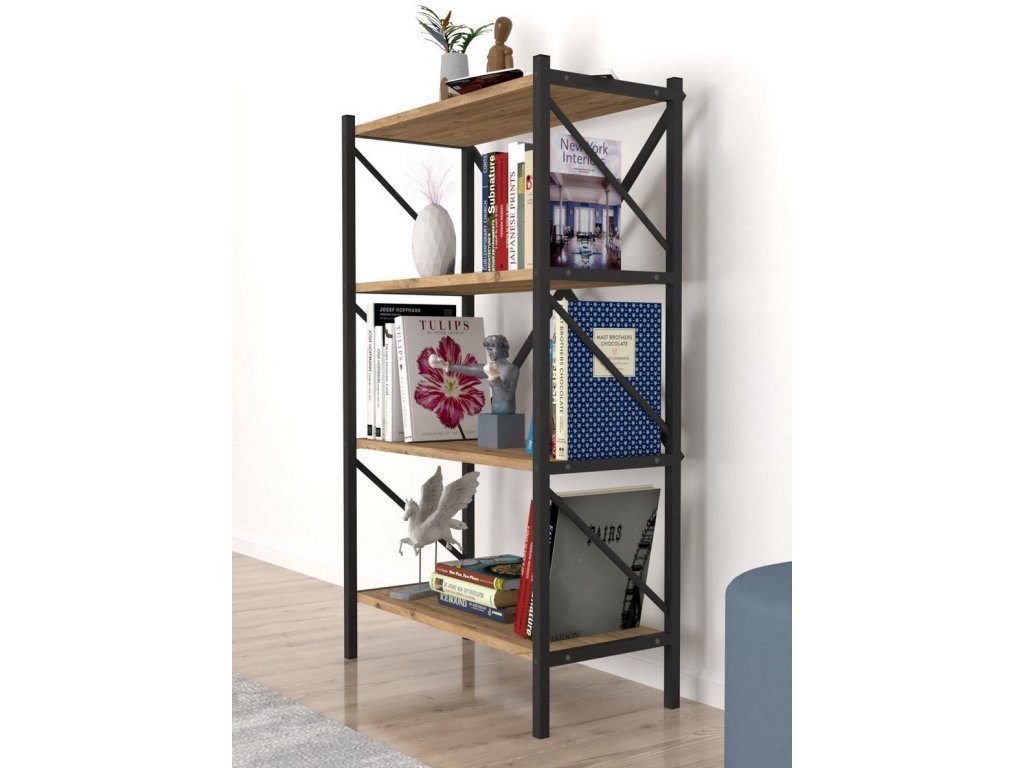 Regál se čtyřmi policemi je z kovového rámu v matné černé barvě a police jsou vyrobeny z kvalitní LTD desky v barvě borovice. Dodáváme v demontovaném stavu.Doplňkové parametry