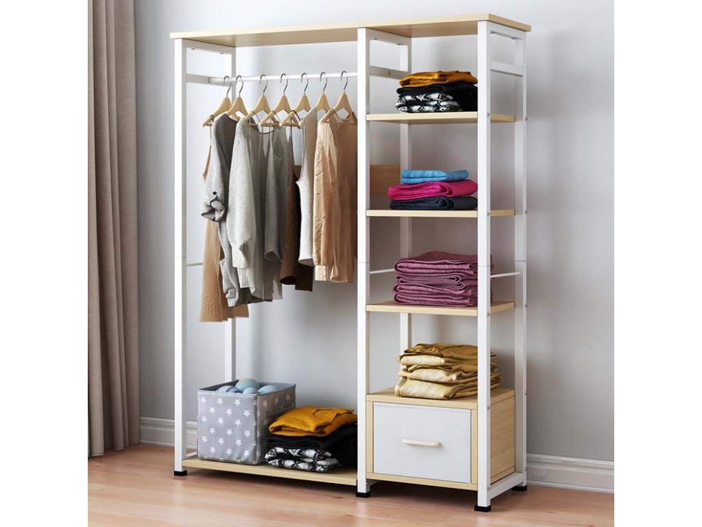 Otevřená šatní skříň (regál) se zásuvkou je vyrobena z desky MDF v kombinaci barev dub sonoma/bílá, konstrukce je vyrobena z kovu v bílé barvě. Vnitřek zásuvky je z pevné látky, co se dá složit. Dodáváme v demontovaném stavu.Doplňkové parametry