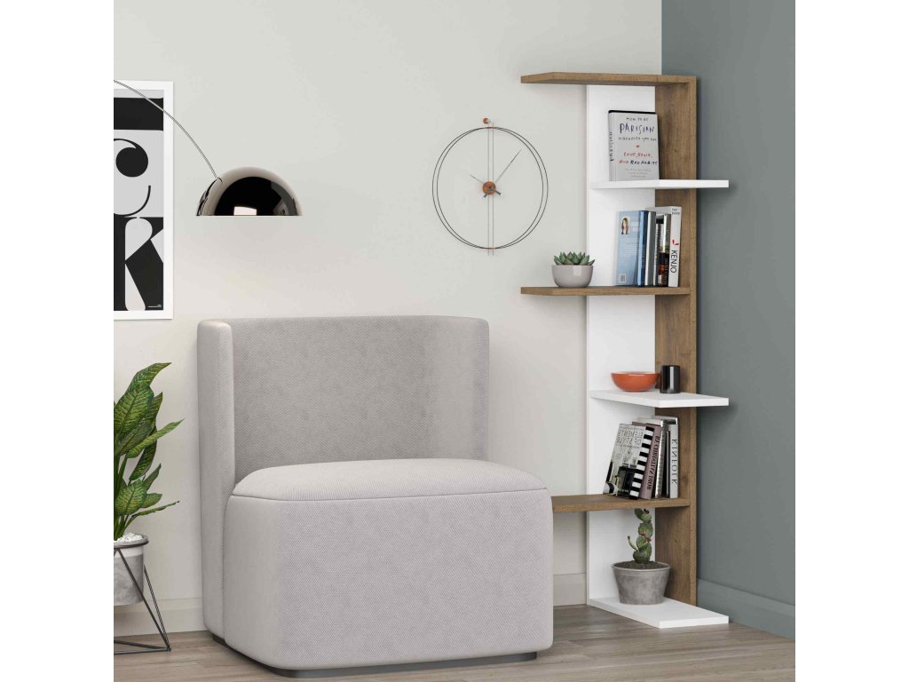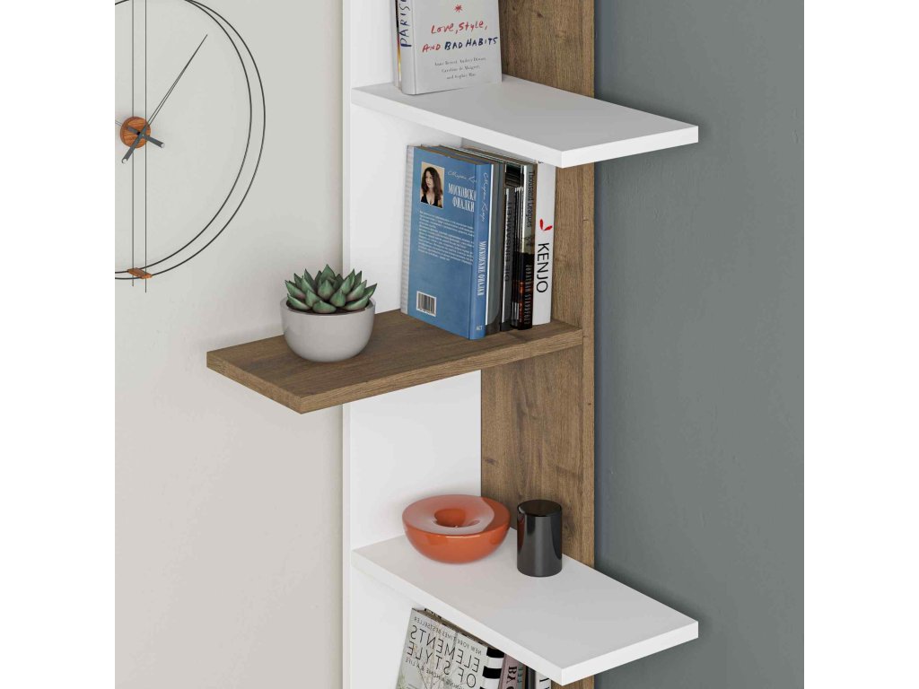 Regál zaujme na první pohled svým jedinečným designem, kde čistá bílá barva harmonicky splynula s teplým tónem ořechu Hit. Jeho rohová struktura vám umožní výhodně využít každý kout obývacího pokoje. Čtyři široké police nabízejí spoustu místa pro knihy, dekorace a další osobní předměty. Díky použití kvalitního melaminu a VT laminátu je regál odolný proti opotřebení a snadno se udržuje.