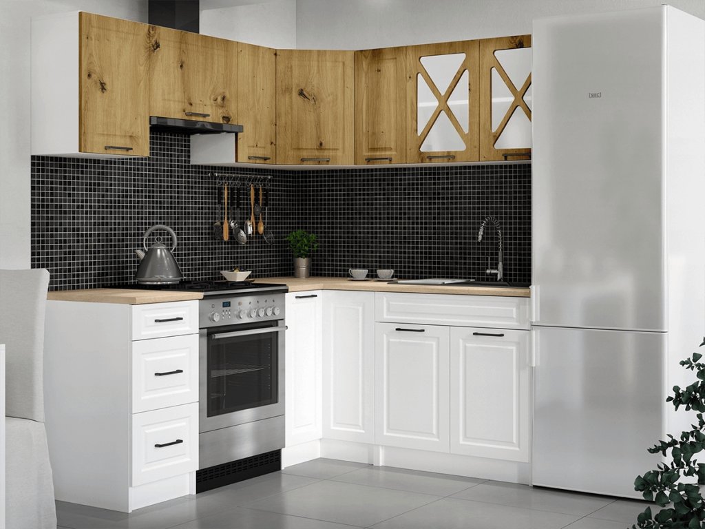 Kuchyňská linka Astra je vyrobená ve venkovském stylu, který se hodí do kuchyně v paneláku i v rodinném domě. Tento styl má jedinečnou schopnost proměnit Vaši kuchyň v útulnou a zároveň funkční místnost, kde bude radost vařit i péct. Rohová kuchyňská linka Astra nabízí dostatek úložného i pracovního prostoru. Kuchyňské skříňky jsou samostatné, takže si je můžete sestavit podle potřeby tak, jak Vám to vyhovuje. Korpusy skříněk jsou vyrobené z lamina 18 mm s hranami ABS a dvířka jsou MDF 16mm. Všechny skříňky jsou dodávány v demontu. Součástí balení je montážní plánek včetně všech potřebných spojovacích prvků. Cena je uvedena za sestavu vyobrazenou na úvodní fotografii BEZ PRACOVNÍ DESKY, s úchytkami, které jsou vyobrazeny v doplňkových fotografiích. Pracovní desku lze dokoupit nad každou skříňku zvlášť podle její šíře. Vyobrazené spotřebiče, dřez, baterie, doplňky a dekorace nejsou v ceně. Kuchyň bude dodaná s bílými korpusy a dvířky v dekóru artisan a bílá.