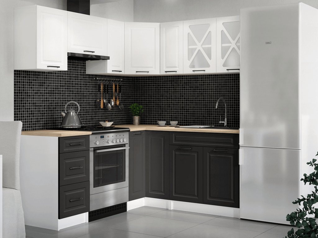 Kuchyňská linka Astra je vyrobená ve venkovském stylu, který se hodí do kuchyně v paneláku i v rodinném domě. Tento styl má jedinečnou schopnost proměnit Vaši kuchyň v útulnou a zároveň funkční místnost, kde bude radost vařit i péct. Rohová kuchyňská linka Astra nabízí dostatek úložného i pracovního prostoru. Kuchyňské skříňky jsou samostatné, takže si je můžete sestavit podle potřeby tak, jak Vám to vyhovuje. Korpusy skříněk jsou vyrobené z lamina 18 mm s hranami ABS a dvířka jsou MDF 16mm. Všechny skříňky jsou dodávány v demontu. Součástí balení je montážní plánek včetně všech potřebných spojovacích prvků. Cena je uvedena za sestavu vyobrazenou na úvodní fotografii BEZ PRACOVNÍ DESKY, s úchytkami, které jsou vyobrazeny v doplňkových fotografiích. Pracovní desku lze dokoupit nad každou skříňku zvlášť podle její šíře. Vyobrazené spotřebiče, dřez, baterie, doplňky a dekorace nejsou v ceně. Kuchyň bude dodaná s bílými korpusy a dvířky v dekóru bílá a grafit.