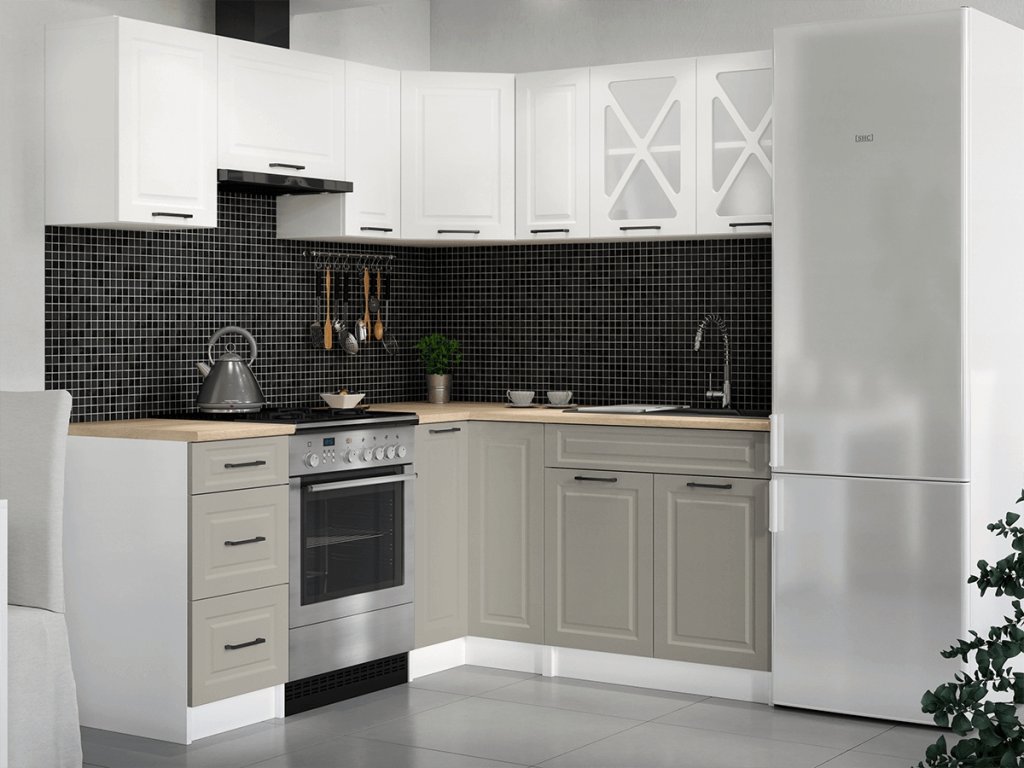 Kuchyňská linka Astra je vyrobená ve venkovském stylu, který se hodí do kuchyně v paneláku i v rodinném domě. Tento styl má jedinečnou schopnost proměnit Vaši kuchyň v útulnou a zároveň funkční místnost, kde bude radost vařit i péct. Rohová kuchyňská linka Astra nabízí dostatek úložného i pracovního prostoru. Kuchyňské skříňky jsou samostatné, takže si je můžete sestavit podle potřeby tak, jak Vám to vyhovuje. Korpusy skříněk jsou vyrobené z lamina 18 mm s hranami ABS a dvířka jsou MDF 16mm. Všechny skříňky jsou dodávány v demontu. Součástí balení je montážní plánek včetně všech potřebných spojovacích prvků. Cena je uvedena za sestavu vyobrazenou na úvodní fotografii BEZ PRACOVNÍ DESKY, s úchytkami, které jsou vyobrazeny v doplňkových fotografiích. Pracovní desku lze dokoupit nad každou skříňku zvlášť podle její šíře. Vyobrazené spotřebiče, dřez, baterie, doplňky a dekorace nejsou v ceně. Kuchyň bude dodaná s bílými korpusy a dvířky v dekóru bílá a světle šedá.