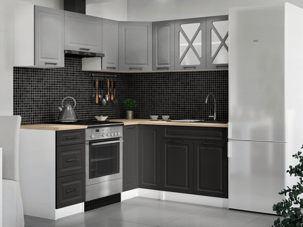 Kuchyňská linka Astra je vyrobená ve venkovském stylu, který se hodí do kuchyně v paneláku i v rodinném domě. Tento styl má jedinečnou schopnost proměnit Vaši kuchyň v útulnou a zároveň funkční místnost, kde bude radost vařit i péct. Rohová kuchyňská linka Astra nabízí dostatek úložného i pracovního prostoru. Kuchyňské skříňky jsou samostatné, takže si je můžete sestavit podle potřeby tak, jak Vám to vyhovuje. Korpusy skříněk jsou vyrobené z lamina 18 mm s hranami ABS a dvířka jsou MDF 16mm. Všechny skříňky jsou dodávány v demontu. Součástí balení je montážní plánek včetně všech potřebných spojovacích prvků. Cena je uvedena za sestavu vyobrazenou na úvodní fotografii BEZ PRACOVNÍ DESKY, s úchytkami, které jsou vyobrazeny v doplňkových fotografiích. Pracovní desku lze dokoupit nad každou skříňku zvlášť podle její šíře. Vyobrazené spotřebiče, dřez, baterie, doplňky a dekorace nejsou v ceně. Kuchyň bude dodaná s bílými korpusy a dvířky v dekóru šedá a grafit.