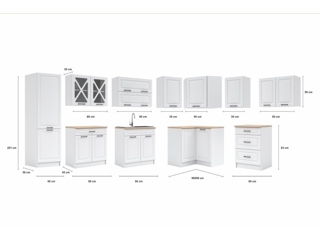 rohová skříňka 80x80 cm, v.83 cm Skutečný rozměr skříňky bez pracovní desky je 80x80 cm/ výška 83 cm, s pracovní deskou je rozměr 90x90 cm. V případě zájmu o dokoupení desky nad tuto skříňku, je potřeba objednat dělenou desku 90 a 30 cm