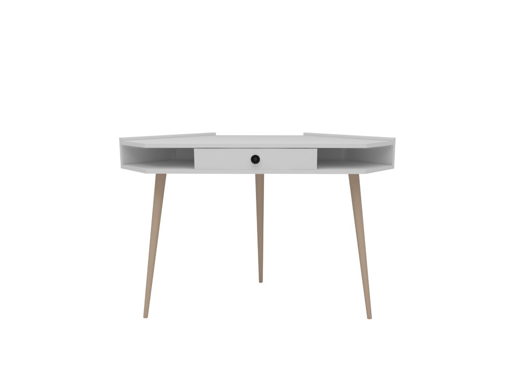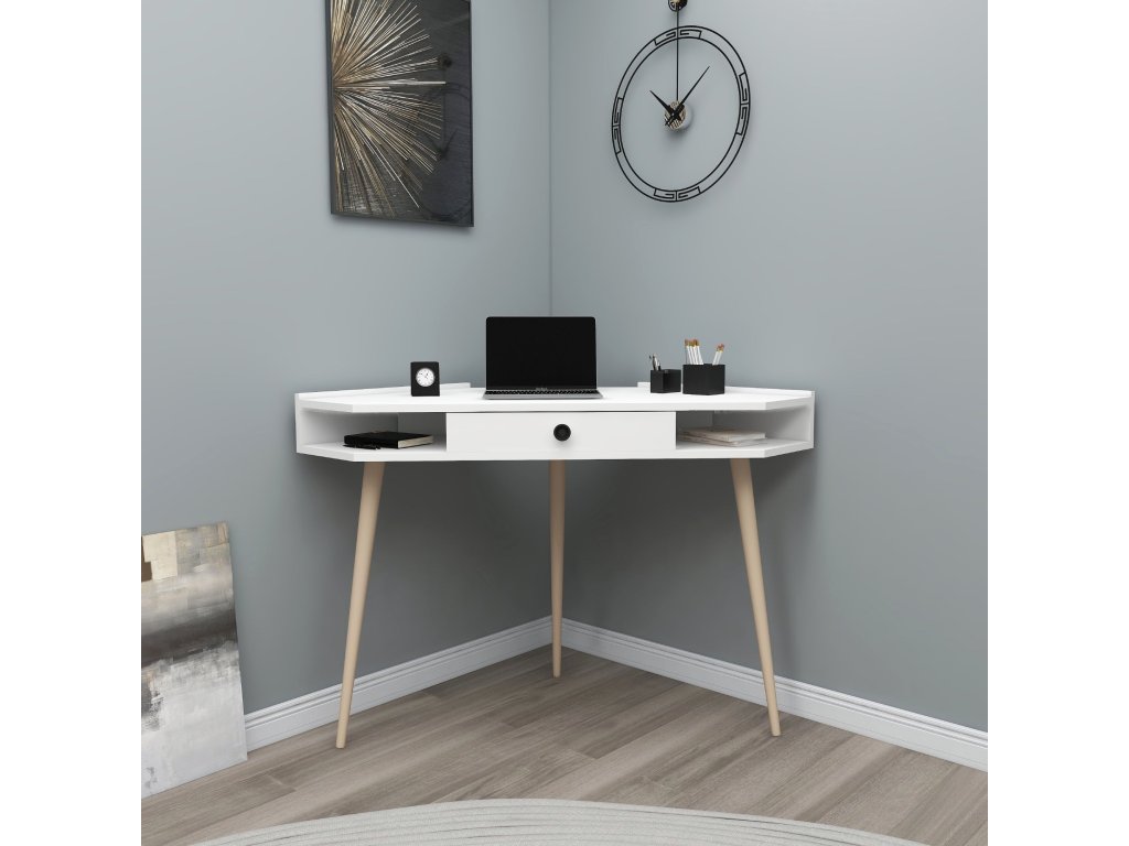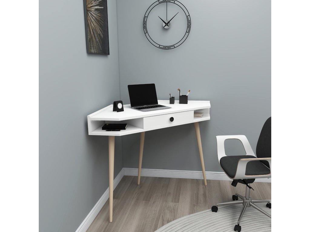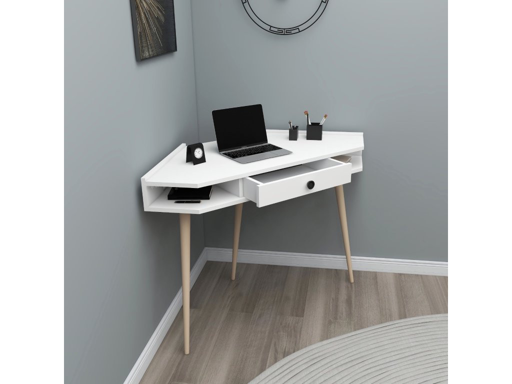 Psací stůl kombinuje moderní design, kvalitní materiály a funkčnost. Tento rohový stůl je ideálním doplňkem do dětského pokoje nebo pracovny, kde poskytuje dostatek prostoru a zároveň stylově doplňuje interiér. Díky dřevěným nohám získává přírodní vzhled a stabilitu.
