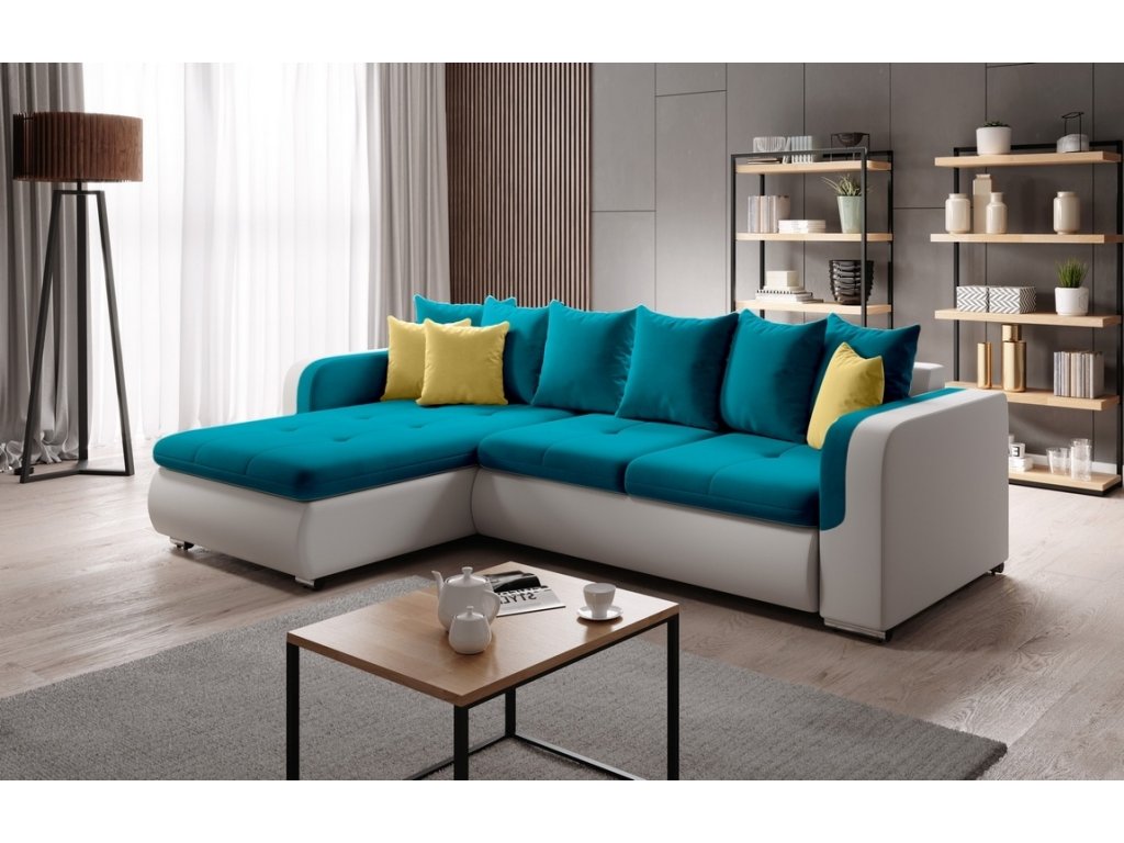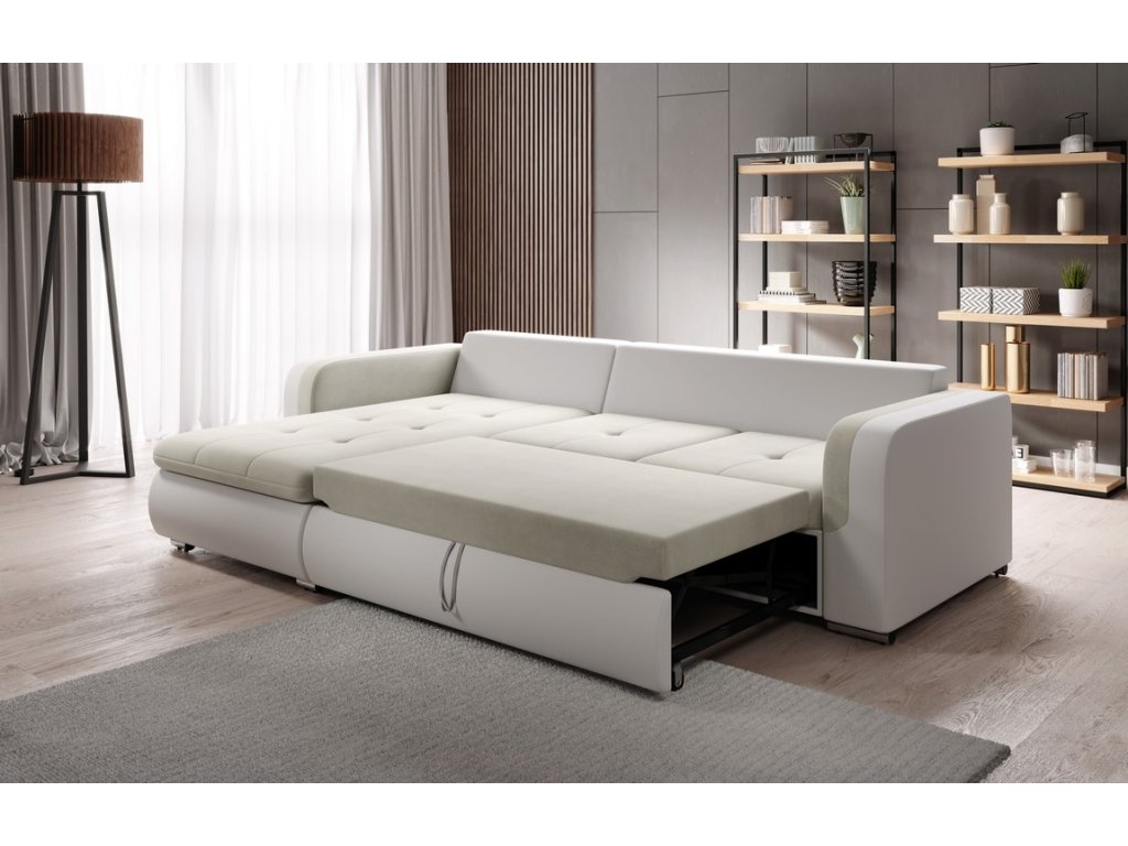 Praktická prostorná celočalouněná rohová sedačka. Netradiční a velmi moderní vzhled. Sedačka obsahuje prostor na příležitostní spaní. Po rozložení je spací plocha 217 x 134 cm. Rozklad je snadný, vysune se vozík s matrací do přední části. Pohodlné sezení zaručují vlnovcové pružiny spolu s PUR pěnou ( T30 ). Výška sedu je 42 cm, hloubka sedu 48 cm, výška sedačky bez polštářů 67 cm. Nožky jsou kovové pochromované. Barevné provedení - korpus ekokůže Madryt 120, sedací a opěrná část látka Amore 06, dekorační polštářky Amore 28.Doplňkové parametry