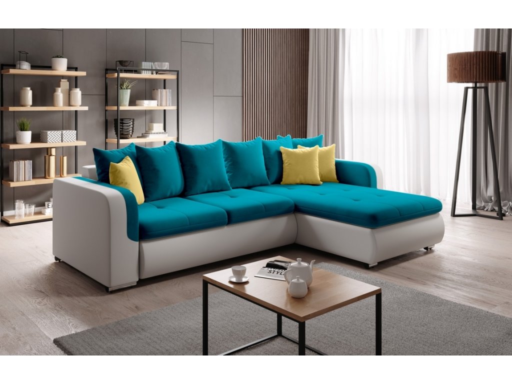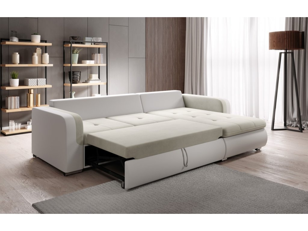 Praktická prostorná celočalouněná rohová sedačka. Netradiční a velmi moderní vzhled. Sedačka obsahuje prostor na příležitostní spaní. Po rozložení je spací plocha 217 x 134 cm. Rozklad je snadný, vysune se vozík s matrací do přední části. Pohodlné sezení zaručují vlnovcové pružiny spolu s PUR pěnou ( T30 ). Výška sedu je 42 cm, hloubka sedu 48 cm, výška sedačky bez polštářů 67 cm. Nožky jsou kovové pochromované. Barevné provedení - korpus ekokůže Madryt 120, sedací a opěrná část látka Amore 06, dekorační polštářky Amore 28.Doplňkové parametry