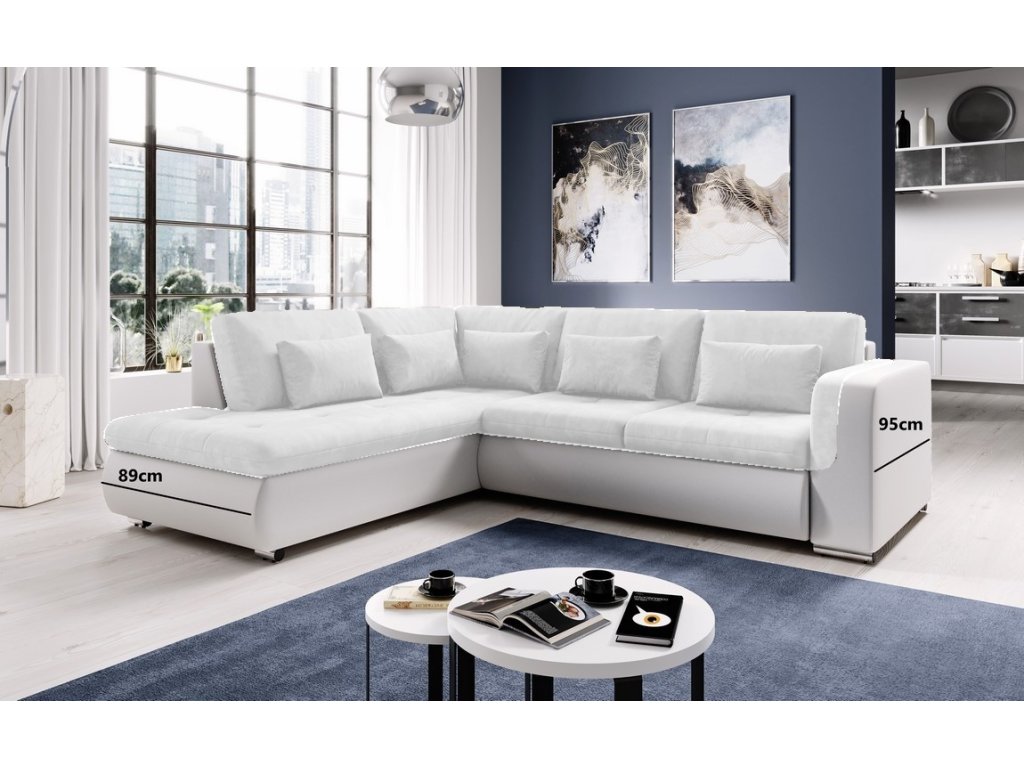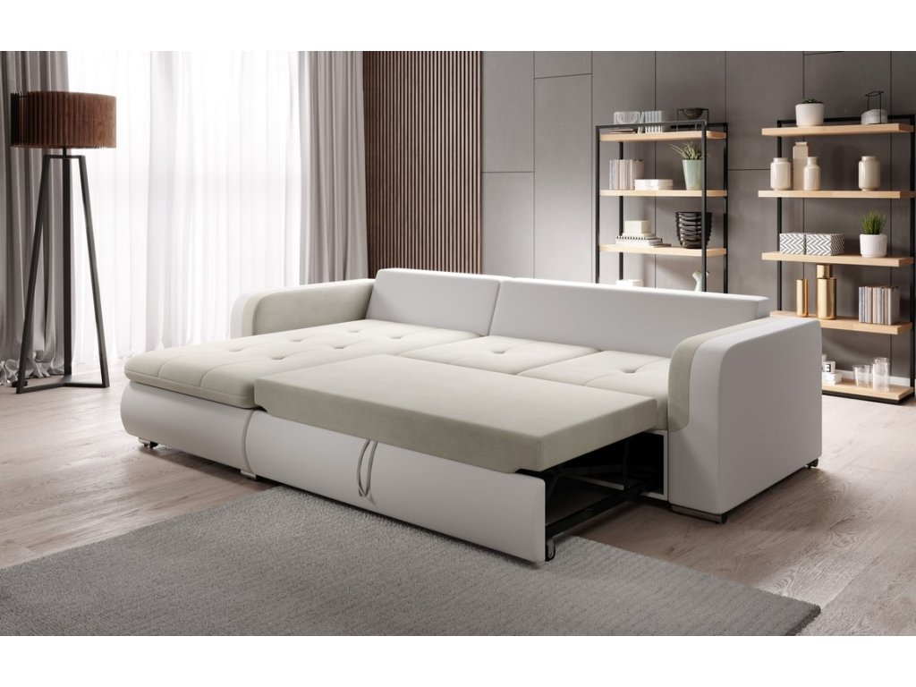 Praktická prostorná celočalouněná rohová sedačka. Netradiční a velmi moderní vzhled. Sedačka obsahuje prostor na příležitostní spaní. Po rozložení je spací plocha 217 x 134 cm. Rozklad je snadný, vysune se vozík s matrací do přední části. Pohodlné sezení zaručují vlnovcové pružiny spolu s PUR pěnou ( T30 ). Výška sedu je 42 cm, hloubka sedu 48 cm, výška sedačky bez polštářů 67 cm. Nožky jsou kovové pochromované. Barevné provedení - korpus ekokůže Madryt 120, sedací a opěrná část látka Amore 28, dekorační polštářky Amore 06.Doplňkové parametry