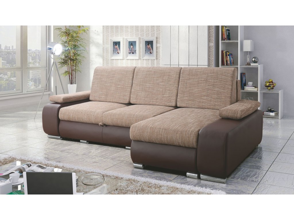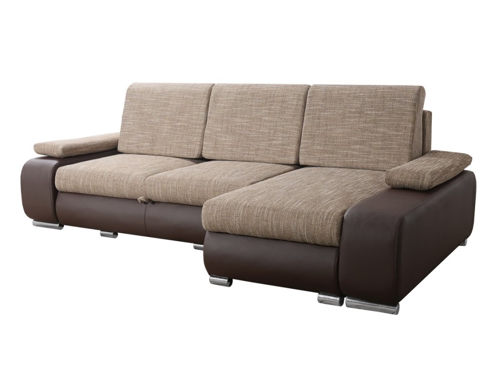 Rozkládací rohová sedačka. Netradiční a velmi moderní vzhled. Sedačka obsahuje úložný prostor a prostor na příležitostní spaní. Po rozložení je spací plocha 203 x 140 cm. Rozklad je snadný, vysune se matrace do přední části, zadní část se sklopí. Šířka je 255 cm, hloubka je 144 cm, celková výška je 90 cm, výška sedu je 43 cm, šířka područí 26 cm. Pohodlné sezení zaručují bonelové pružiny spolu s PUR pěnou. Sedačka je univerzální, dá se složit na obě strany. Barevné provedení - ekokůže Madryt 128 tmavě hnědá a žíhaná látka Berlin 03 světle hnědá.Doplňkové parametry