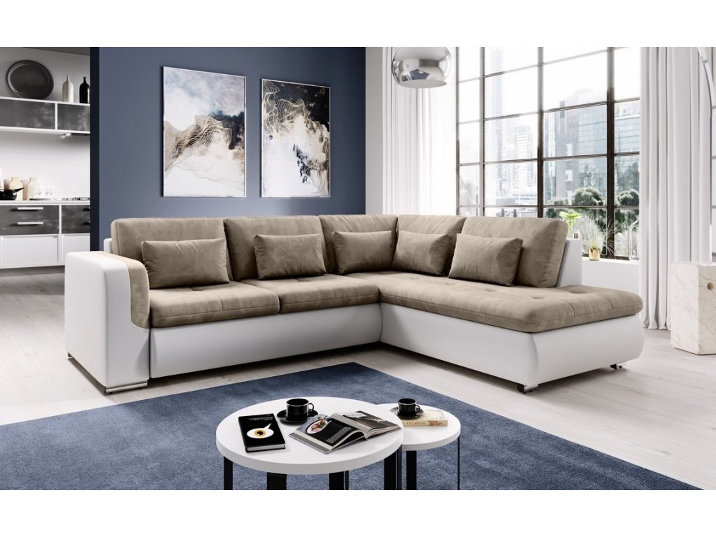 Praktická prostorná celočalouněná rohová sedačka do tvaru L. Netradiční a velmi moderní vzhled. Sedačka obsahuje prostor na příležitostní spaní. Po rozložení je spací plocha 195 x 134 cm. Rozklad je snadný, vysune se vozík s matrací do přední části. Pohodlné sezení zaručují vlnovcové pružiny spolu s PUR pěnou ( T30 ). Výška sedu je 42 cm, hloubka sedu 48 cm, výška sedačky bez polštářů 67 cm. Nožky jsou kovové pochromované. Barevné provedení - korpus ekokůže Madryt 120, sedací a opěrná část látka Paros 3, dekorační polštářky Paros 3.Doplňkové parametry