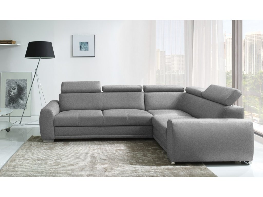 Praktická celočalouněná rohová sedačka s rohem napravo. Netradiční a velmi moderní vzhled. Sedačka obsahuje úložný prostor a prostor na příležitostní spaní. Po rozložení je spací plocha 205 x 130 cm. Rozklad je snadný pomocí automatu. Pohodlné sezení zaručují vlnovcové a profilované pružiny spolu s visoceelastickou PUR pěnou. Nožky jsou kovové. Velkou výhodou sedačky jsou 5 polohovatelných opěrek na hlavu pro větší pohodlí. Po zvednutí zádové opěrky je výška sedací soupravy 90 cm. Barevné provedení - látka Element 23. Můžete si vybrat výběr rohu v naší nabídce.Doplňkové parametry