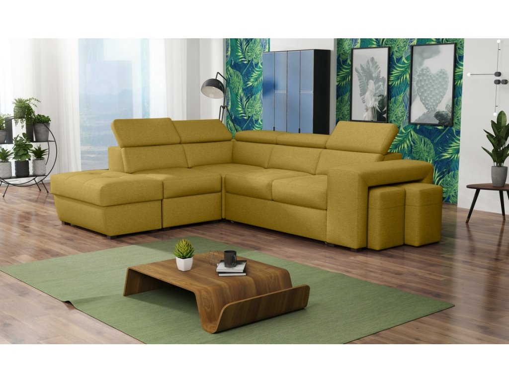 Elegantní celočalouněná rozkládací rohová sedačka ve tvaru L s regulovatelnými opěrkami. Rozkládá se vysunutím přední části pomocí automatu na pístech ( viz. obrázky ). Spací plocha po rozložení je 188 x 115 cm. Sedačka obsahuje také dva taburety schované pod boční opěrkou a praktický úložný prostor. Díky kombinaci vlnovcových a bonelových pružin s HR PUR pěnou zaručuje sedačka komfortní pohodlí. Hloubka sedu je 55 cm, výška sedu 46 cm. Barevné provedení - látka Metro 45.Doplňkové parametry