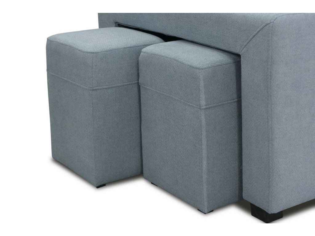 Elegantní celočalouněná rozkládací rohová sedačka ve tvaru L s regulovatelnými opěrkami. Rozkládá se vysunutím přední části pomocí automatu na pístech ( viz. obrázky ). Spací plocha po rozložení je 188 x 115 cm. Sedačka obsahuje také dva taburety schované pod boční opěrkou a praktický úložný prostor. Díky kombinaci vlnovcových a bonelových pružin s HR PUR pěnou zaručuje sedačka komfortní pohodlí. Hloubka sedu je 55 cm, výška sedu 46 cm. Barevné provedení - látka Metro 45.Doplňkové parametry