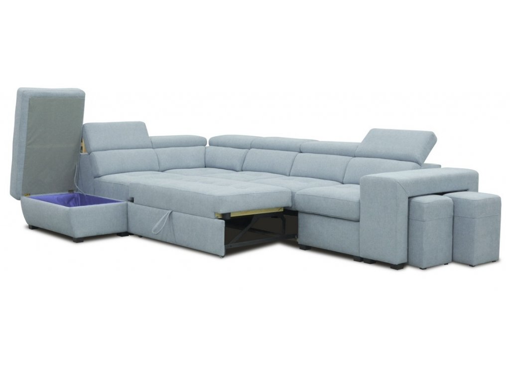 Elegantní celočalouněná rozkládací rohová sedačka ve tvaru L s regulovatelnými opěrkami. Rozkládá se vysunutím přední části pomocí automatu na pístech ( viz. obrázky ). Spací plocha po rozložení je 188 x 115 cm. Sedačka obsahuje také dva taburety schované pod boční opěrkou a praktický úložný prostor. Díky kombinaci vlnovcových a bonelových pružin s HR PUR pěnou zaručuje sedačka komfortní pohodlí. Hloubka sedu je 55 cm, výška sedu 46 cm. Barevné provedení - látka Ocean 05.Doplňkové parametry