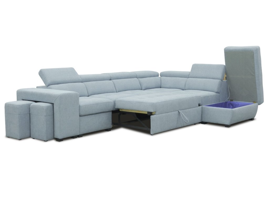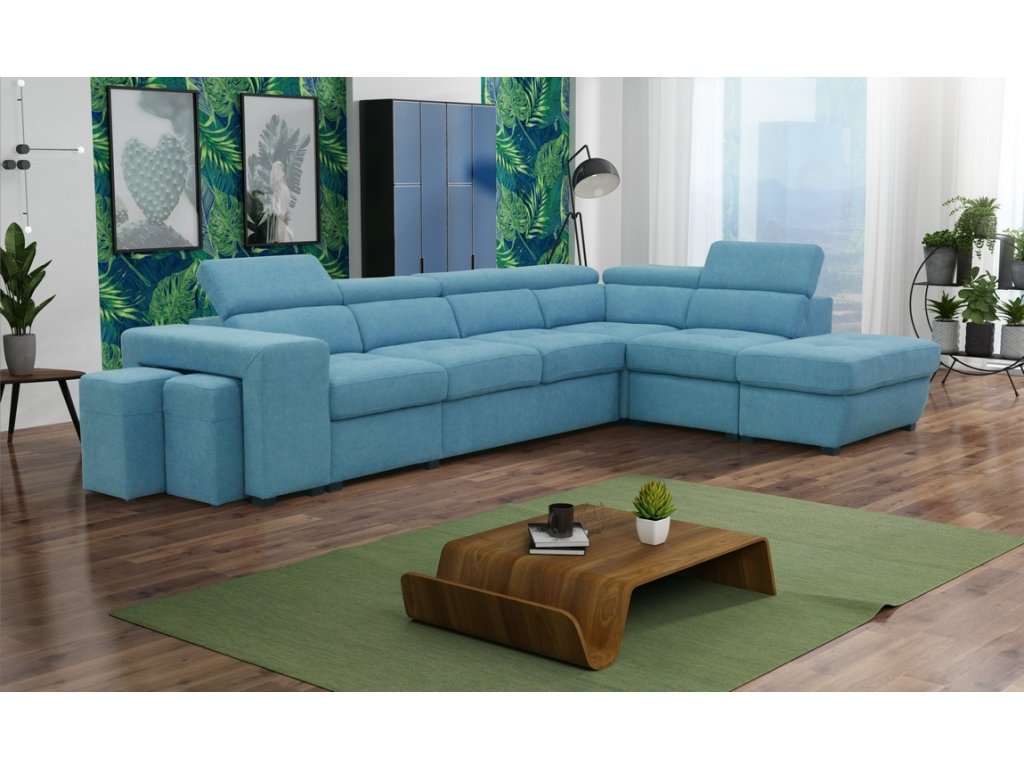 Elegantní celočalouněná rozkládací rohová sedačka ve tvaru L s regulovatelnými opěrkami. Rozkládá se vysunutím přední části pomocí automatu na pístech ( viz. obrázky ). Spací plocha po rozložení je 188 x 115 cm. Sedačka obsahuje také dva taburety schované pod boční opěrkou a praktický úložný prostor. Díky kombinaci vlnovcových a bonelových pružin s HR PUR pěnou zaručuje sedačka komfortní pohodlí. Hloubka sedu je 55 cm, výška sedu 46 cm. Barevné provedení - látka Ocean 18.Doplňkové parametry