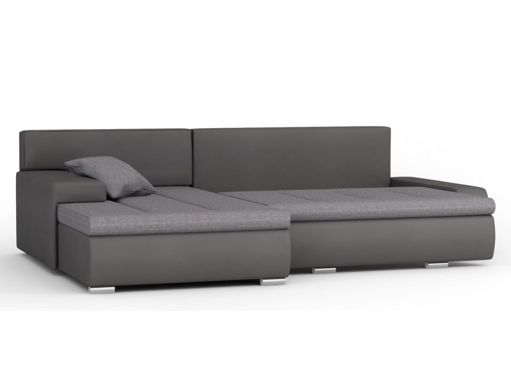 Praktická rohová sedačka. Netradiční a velmi moderní vzhled. Sedačka obsahuje úložný prostor a prostor na příležitostní spaní. Po rozložení je spací plocha 206 x 149 cm. Výška sedáku je 39 cm. Rozklad je snadný, pomocí automatu se vysune vozík s matrací do přední části. Nožky jsou z pochromovaného kovu. Pohodlné sezení zaručuje kvalitní PUR pěna ( T30 ) spolu s vlnovcovými pružinami. Sedačka je univerzální, dá se složit na obě strany. Barevné provedení - korpus ekokůže Madryt 1100 ( černá ) a sedací a opěrná část pevná žíhaná látka Berlin 02 ( černošedá ).Doplňkové parametry