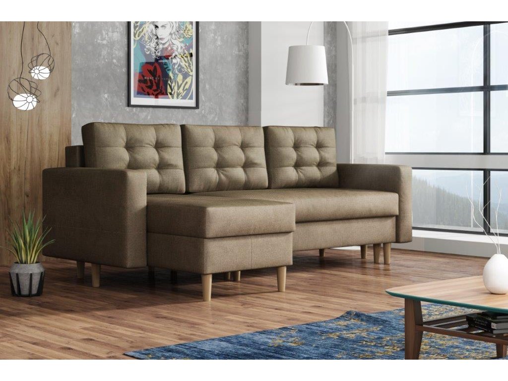 Sedací souprava Anabel je krásným designovým RETRO kouskem, který výborně zapadne do moderního i klasického interiéru. Retro design podtrhují dřevěné nohy a vtahy na opěrných polštářích. Její velkou předností je pohodlí, praktičnost a univerzální použití. Tzn. že si ji můžete podle potřeby sestavit jako levou nebo pravou, což je výhoda při zařizování obývacího pokoje. Nemusíte přemýšlet do jakého rohu postavíte sedací soupravu, jednoduše ji podle potřeby přizpůsobíte. Sedací souprava je rozkládací a může tak sloužit k občasnému přespání Vaší návštěvy. Samozřejmostí je i praktický úložný prostor, který je v obou částech sedačky a můžete ho využít např. na lůžkoviny. Sedací souprava je potažena látkou a nabízíme v několika oblíbených barvách. Výplň sedáků tvoří kombinace pružin s kvalitní PUR pěnou, což zajišťuje velmi pohodlné sezení. Sedací souprava je vhodná i do menších pokojů. Vyobrazené doplňky a dekorace nejsou v ceně.