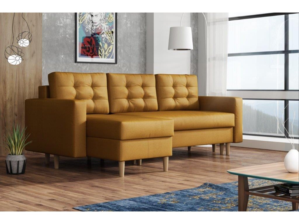 Sedací souprava Anabel je krásným designovým RETRO kouskem, který výborně zapadne do moderního i klasického interiéru. Retro design podtrhují dřevěné nohy a vtahy na opěrných polštářích. Její velkou předností je pohodlí, praktičnost a univerzální použití. Tzn. že si ji můžete podle potřeby sestavit jako levou nebo pravou, což je výhoda při zařizování obývacího pokoje. Nemusíte přemýšlet do jakého rohu postavíte sedací soupravu, jednoduše ji podle potřeby přizpůsobíte. Sedací souprava je rozkládací a může tak sloužit k občasnému přespání Vaší návštěvy. Samozřejmostí je i praktický úložný prostor, který je v obou částech sedačky a můžete ho využít např. na lůžkoviny. Sedací souprava je potažena látkou a nabízíme v několika oblíbených barvách. Výplň sedáků tvoří kombinace pružin s kvalitní PUR pěnou, což zajišťuje velmi pohodlné sezení. Sedací souprava je vhodná i do menších pokojů. Vyobrazené doplňky a dekorace nejsou v ceně.