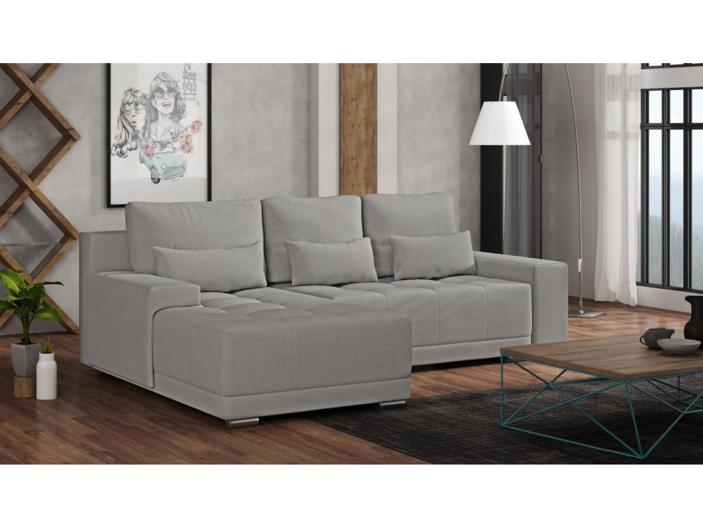 Sedací souprava Lacom výborně zapadne do moderního i klasického interiéru. Její velkou předností je pohodlí, praktičnost a univerzální použití. Tzn. že si ji můžete podle potřeby sestavit jako levou nebo pravou, což je výhoda při zařizování obývacího pokoje. Nemusíte přemýšlet do jakého rohu postavíte sedací soupravu, jednoduše ji podle potřeby přizpůsobíte. Sedací souprava je rozkládací a může tak sloužit k občasnému přespání Vaší návštěvy. Samozřejmostí je i praktický úložný prostor, který můžete využít např. na lůžkoviny. Sedací souprava je potažena kvalitní látkou a nabízíme ji v několika trendy odstínech. Výplň sedáků tvoří kombinace pružin s kvalitní PUR pěnou, což zajišťuje velmi pohodlné sezení. Součástí sedací soupravy jsou tři velké opěrné a tři malé dekorační polštáře. Vyobrazené doplňky a dekorace nejsou v ceně.