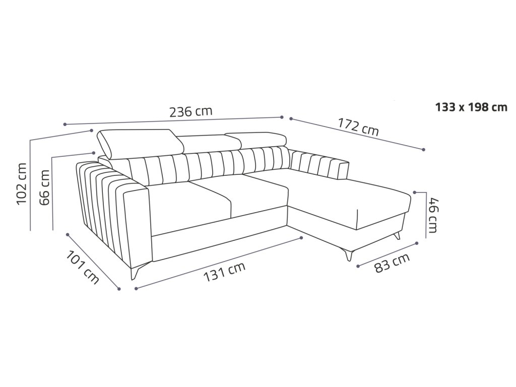 Sedací souprava Mildred osloví každého, kdo preferuje moderní vzhled a zároveň pohodlí a praktičnost. Je potažena kvalitní potahovou látkou s kontrastním prošitím. Sedací souprava je velmi pohodlná a dostatečně velká na posezení s přáteli, nebo rodinou. Pro případ, že se návštěva zdrží přes noc, je sedací souprava vybavena rozkladem, díky kterému sedací soupravu jednoduše přeměníte v prostorné lůžko. Sedací souprava má praktický úložný prostor, který můžete využít např., na lůžkoviny. Pohodlí při sezení zajišťuje výplň sedáků, kterou tvoří kombinace pružin faliste s kvalitní PUR pěnou. Komfort a pohodlí při odpočinku zvyšuje polohovací opěrka hlavy. Sedací soupravu nabízíme v levém i pravém provedení.