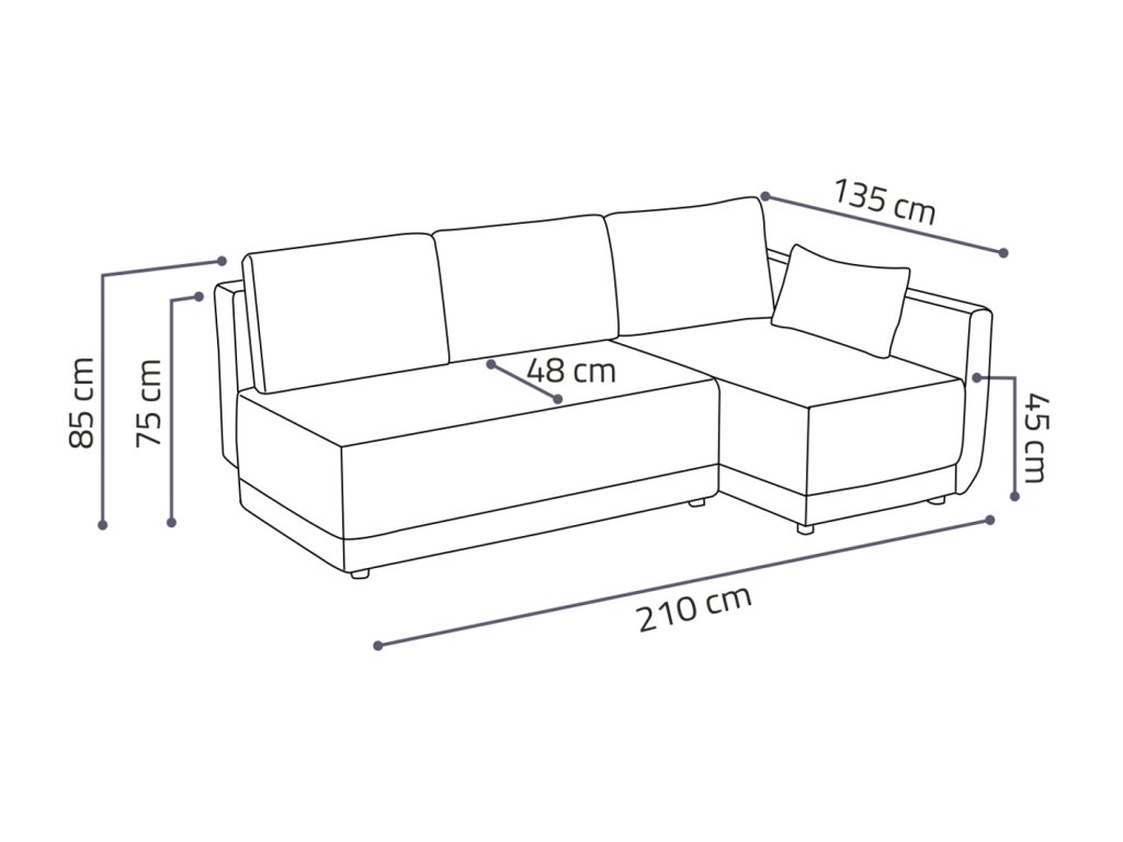 Moderní rohová sedací souprava Vás zaujme svým jednoduchým designem. Součástí jsou polštáře, které dělají sedací soupravu velice pohodlnou. Díky svým rozměrům je vhodná i do menších pokojů. Je praktická, rozklad lze použít k občasnému přespání, plocha lůžka je 198x133 cm. Uvnitř sedací soupravy je úložný prostor, který je možné využít k uložení lůžkovin. Výplň sedáku tvoří pružiny bonell v kombinaci s kvalitní PUR pěnou. Sedací soupravu nabízíme v několika barevných provedeních. Fotografie sedací soupravy v rozkladu jsou pouze ilustrační. Správný barevný odstín je na úvodní fotografii.