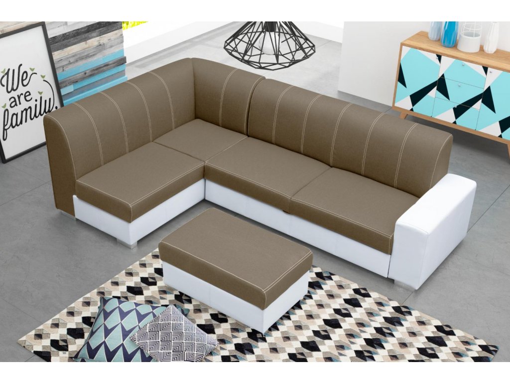 Rohová sedací souprava Rest s taburetem zdarma je vhodná do všech moderních interiérů. Je rozkládací a má praktický úložný prostor. Pohodlnost sezení zajišťuje kombinace pružin faliste s kvalitní PUR pěnou. Jednoduchým rozkladem vznikne lůžko vhodné k příležitostnému spaní. Sedací soupravu nabízíme v kvalitní potahové látce v kombinaci s bílou EKO kůží, a to v několika barevných provedeních, které také najdete v naší nabídce. V ceně sedací soupravy je taburet 55x90 cm. Ostatní vyobrazené dekorace nejsou v ceně.