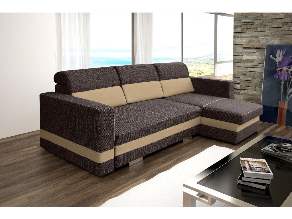 Elegantní rohová sedací souprava Rimini je rozkládací a má také 2 praktické úložné prostory. Díky svým rozměrům je vhodná i do menších pokojů. Jednoduchým rozložením pomocí automatu, vznikne dostatečně velké lůžko vhodné k příležitostnému spaní. Výplň sedáku tvoří kombinace pružin bonell s kvalitní PUR pěnou. Tato kombinace zajistí velmi pohodlné sezení. Sedací souprava je potažena kvalitní látkou v kombinaci 2 barev, a to v několika odstínech. V ceně sedací soupravy jsou 3 velké opěrné polštáře. Ostatní vyobrazené dekorace nejsou v ceně.