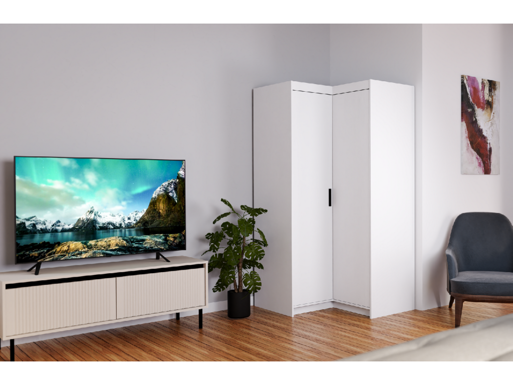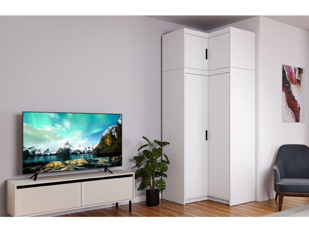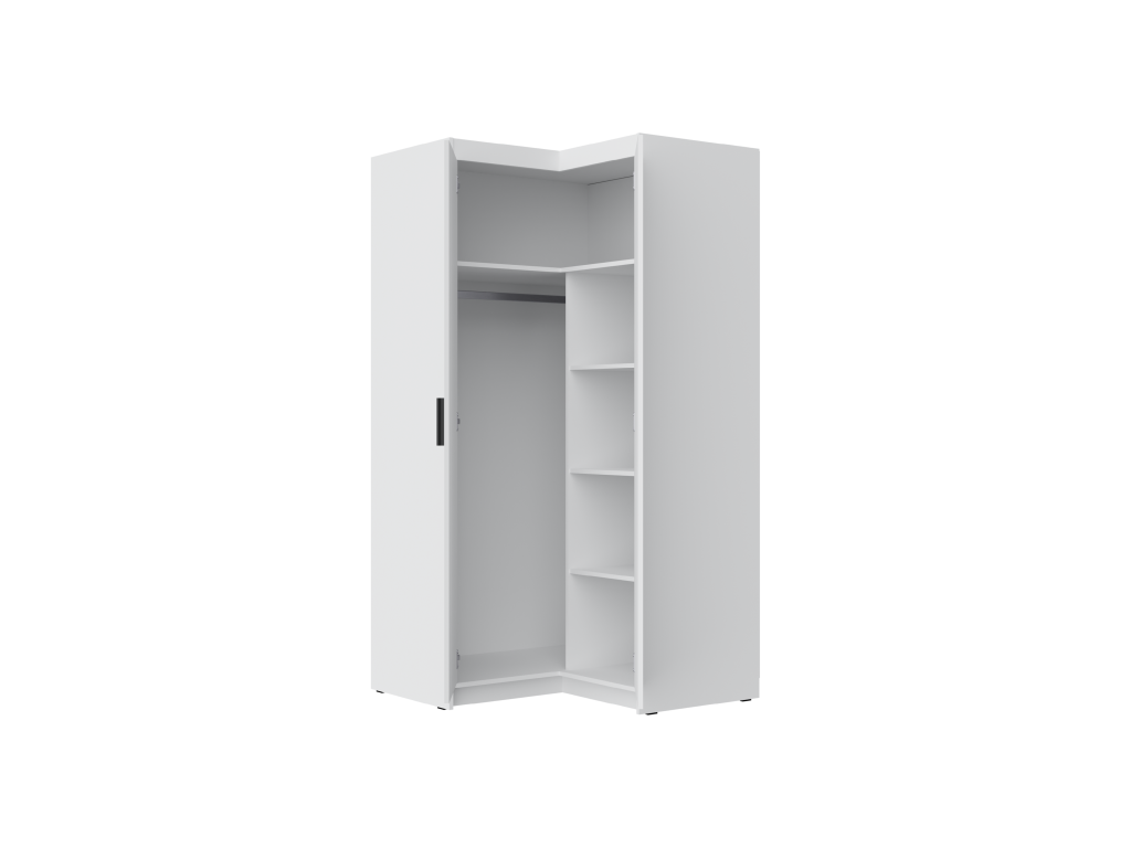 Rohové provedení se hodí hlavně do ložnice nebo dětského pokoje, kde oceníte lepší práci s dispozicí místnosti. Uvnitř najdete kombinaci polic a šatní tyče, takže snadno oddělíte zavěšené oblečení od složených věcí.
