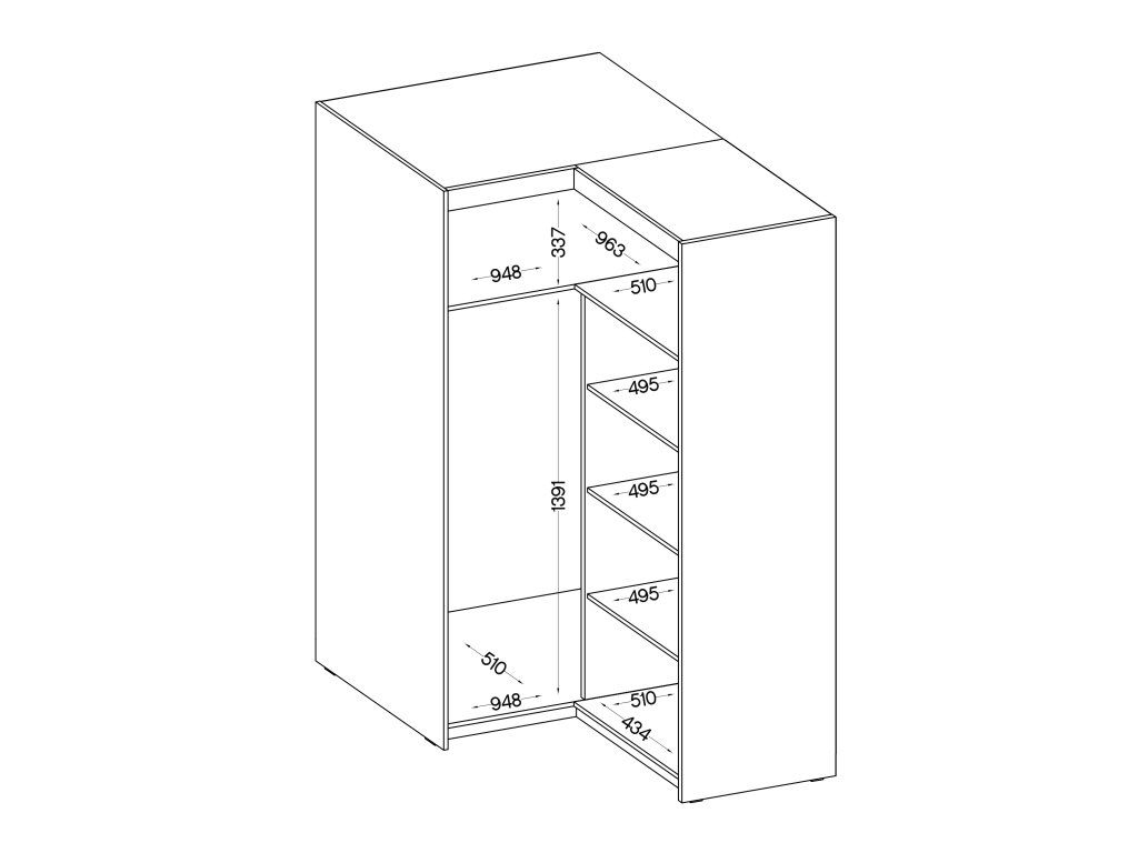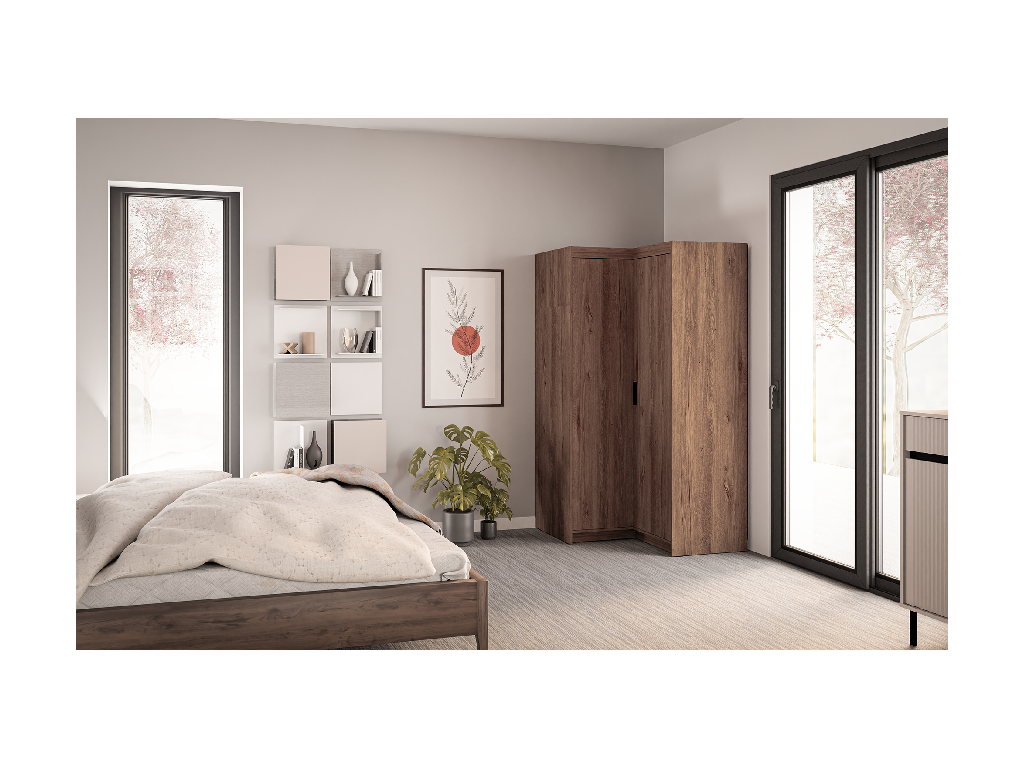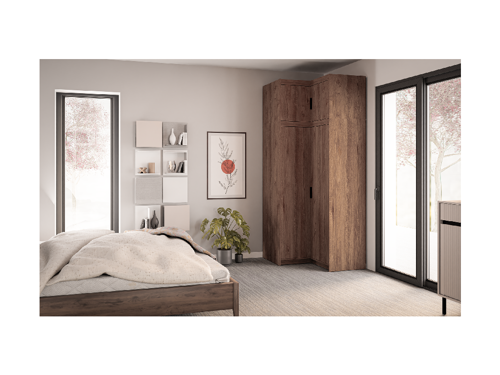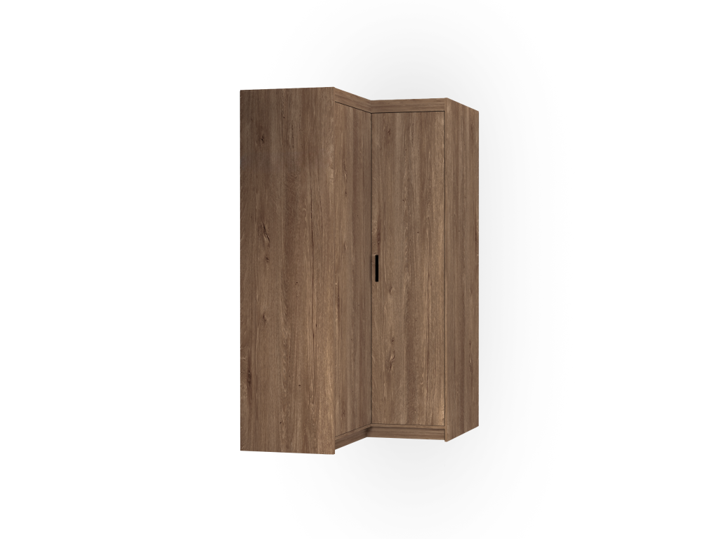 Rohové provedení se hodí hlavně do ložnice nebo dětského pokoje, kde oceníte lepší práci s dispozicí místnosti. Uvnitř najdete kombinaci polic a šatní tyče, takže snadno oddělíte zavěšené oblečení od složených věcí.