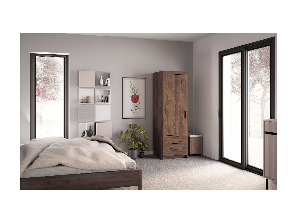 Kombinace šatní tyče, polic a zásuvek usnadní uložení oblečení, prádla i doplňků bez nutnosti pořizovat další nábytek. Skříň se hodí do ložnice, dětského pokoje i studentského interiéru.