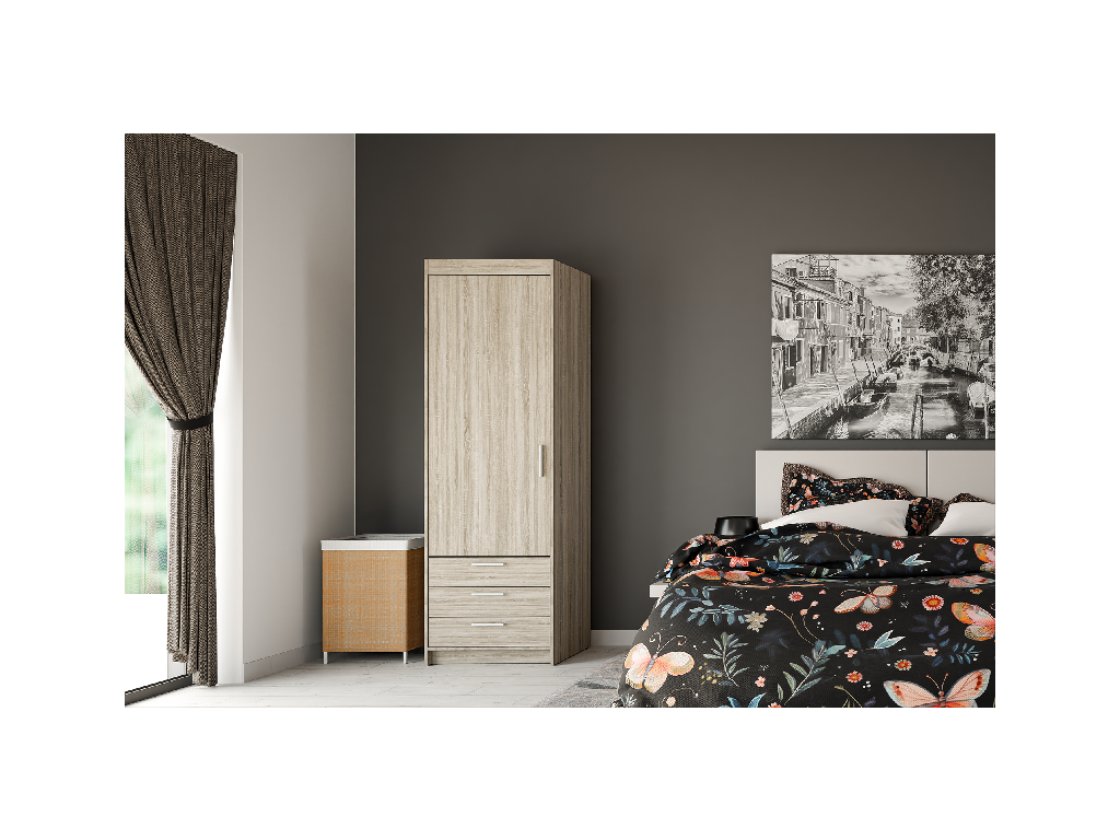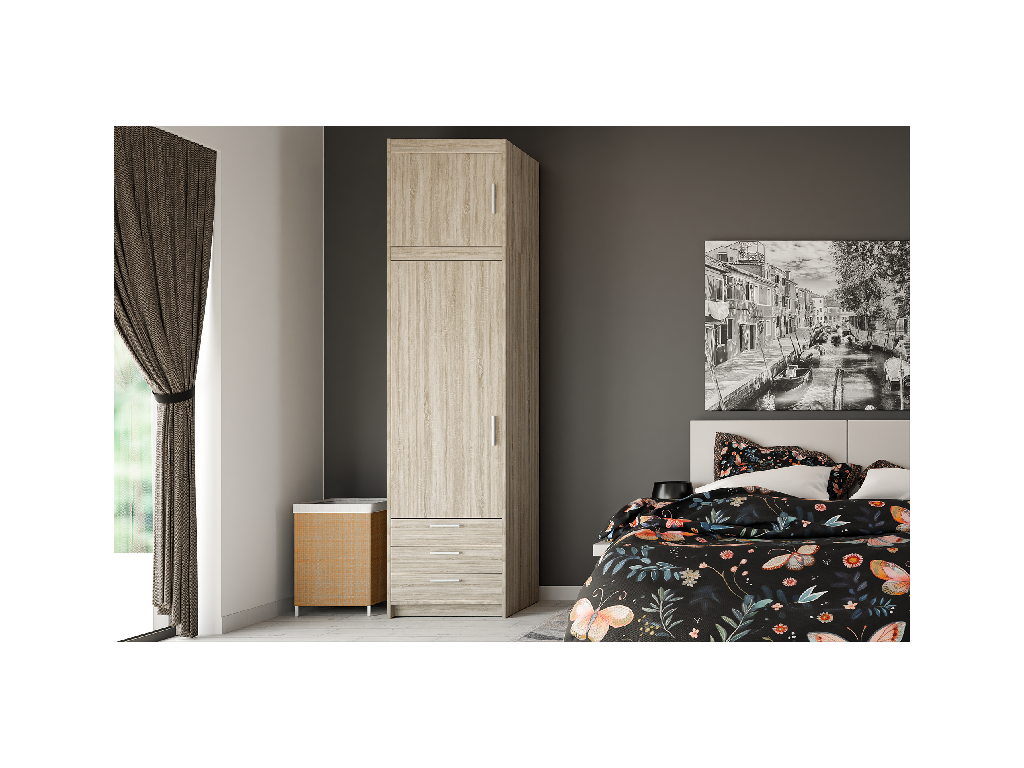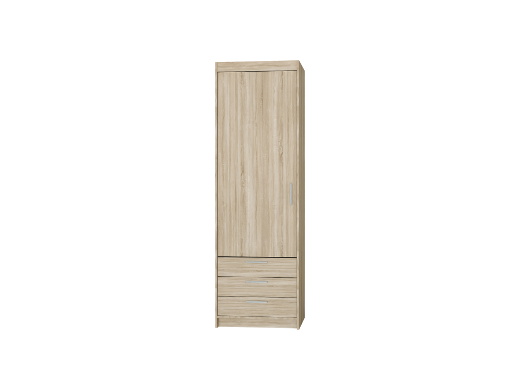 Šatní skříň Elena 1D 3S dub sonoma je praktická volba do menších místností, kde chcete vytěžit maximum z dostupného prostoru. Úzké provedení doplňuje prostor pro zavěšení oblečení i zásuvky pro drobnější věci, takže vše zůstane přehledně uspořádané.