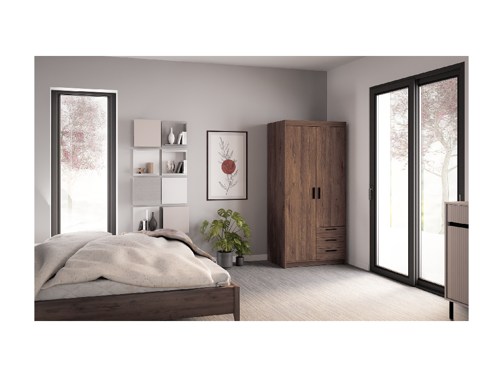 Šatní skříň Elena 2D 3S dub lefkas je ideální pro domácnosti, které chtějí spojit klasický šatní prostor se zásuvkami v jednom kusu nábytku. Díky tomu budete mít přehledně oddělené oblečení na ramínkách, složené věci i drobnější doplňky.