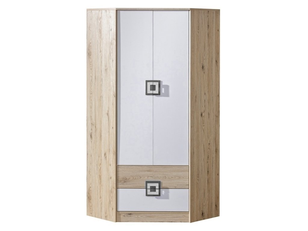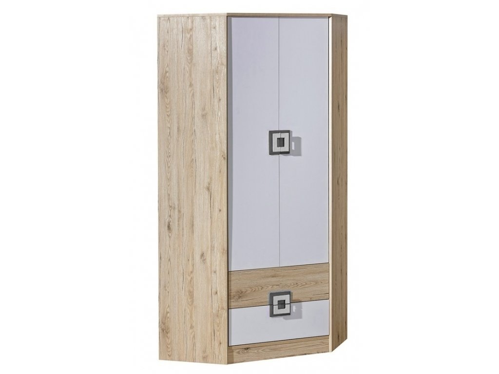 Rohová šatní skříň NIKO ze sektorové řady, která se vyznačuje netradičním zpracováním barev a originalitou úchytů. Tento styl nábytku zaujme každou mladší generaci. Skříň je vyrobena z kvalitní LTD desky hraněné ABS lištou. Korpus je v barvě dub jasný, dveře jsou v kombinaci barev bílá mat / dub jasný. Úchytky jsou v barevné kombinaci popel / bílá. Uvnitř skříně je šatníková tyč, 3 police a v dolní části jsou 2 zásuvky. Sektorový nábytek NIKO má široký výběr prvků, který Vám zaručí sestavit si dětský nebo studentský pokoj, ložnici či kancelář podle svých potřeb, přání a představ. Dodáváme v demontovaném stavu.Doplňkové parametry
