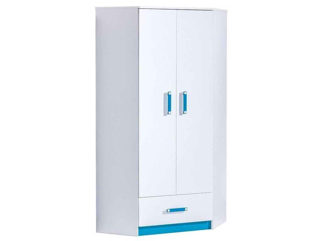 Rohová šatní skříň TRAFICO ze sektorové řady, která se vyznačuje netradičním zpracováním barev a originalitou úchytů. Tento styl nábytku zaujme každou mladší generaci. Skříň je vyrobena z kvalitní LTD desky hraněné ABS lištou. Korpus i dveře jsou v bílé matné barvě, doplňková barva je tyrkys. Úchytky jsou v barevné kombinaci tyrkys/bílá. Uvnitř skříně je šatníková tyč a 3 police, v dolní části je zásuvka. Sektorový nábytek TRAFICO má široký výběr prvků, který Vám zaručí sestavit si dětský nebo studentský pokoj, ložnici či kancelář podle svých potřeb, přání a představ. Dodáváme v demontovaném stavu.Doplňkové parametry
