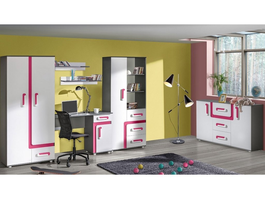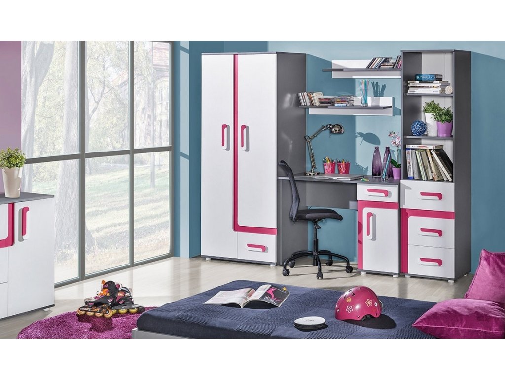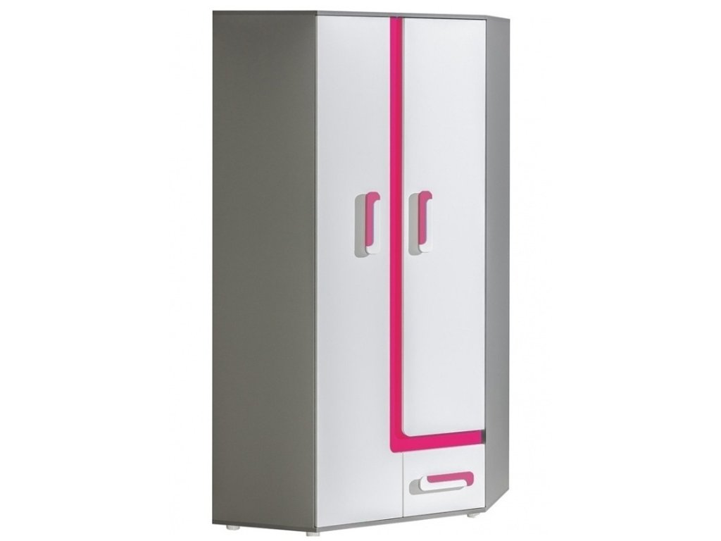 Šatní skříň rohová APETTITA ze sektorové řady, která se vyznačuje netradičním zpracováním barev a originalitou úchytů. Tento styl nábytku zaujme každou mladší generaci. Skříň je vyrobena z kvalitní LTD desky hraněné ABS lištou. Korpus je v barvě antracit, dveře jsou bílé matné, doplňková barva je růžová. Úchytky jsou v barevné kombinaci růžová/bílá. Uvnitř skříně je šatníková tyč a police, v dolní části je zásuvka. Sektorový nábytek APETTITA má široký výběr prvků, který Vám zaručí sestavit si dětský nebo studentský pokoj, ložnici či kancelář podle svých potřeb, přání a představ. Dodáváme v demontovaném stavu.Doplňkové parametry