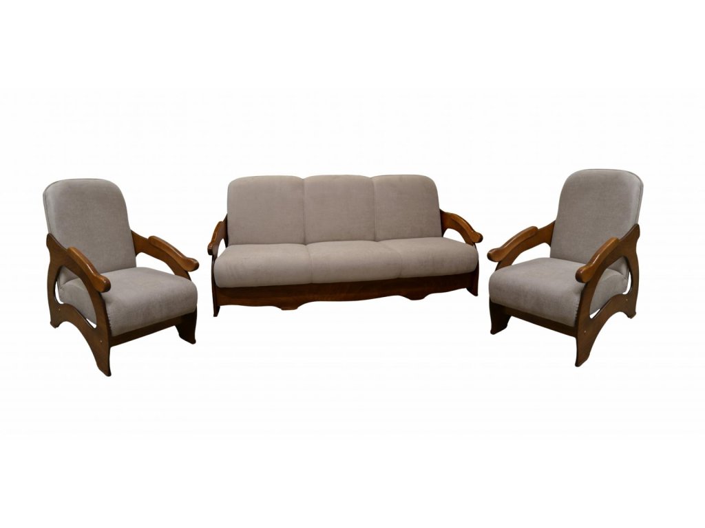 Sedací souprava Viki s rozkládacím trojsedem a dvěma křesly. Sedací souprava má úložný prostor a jednoduchým rozkladem vznikne lůžko 188x130 cm na občasné přespání pro dvě osoby. Výplň sedáku tvoří pružiny bonell v kombinaci s kvalitní PUR pěnou. Sedací souprava je očalouněná kvalitní látkou Velo, která je velmi příjemná na dotek a je odolná proti vsakování tekutin. Čalounění v kombinaci se dřevem působí velice stylově. Bočnice jsou vyrobené z bukového masivu, moření je možné v různých barevných odstínech. Sedací soupravu lze objednat i v jiných barevných provedeních (viz. vzorník látek níže). Odstíny nebo kresba dřeva nemusí přesně odpovídat vyobrazeným vzorkům.