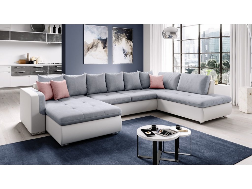 Praktická prostorná celočalouněná rohová sedačka do tvaru U. Netradiční a velmi moderní vzhled. Sedačka obsahuje prostor na příležitostní spaní. Po rozložení je spací plocha 285 x 135 cm. Rozklad je snadný, vysune se vozík s matrací do přední části. Pohodlné sezení zaručují vlnovcové pružiny spolu s PUR pěnou ( T30 ). Výška sedu je 41 cm, hloubka sedu 48 cm ( bez polštářů 63 cm ), výška sedačky bez polštářů 65 cm. Nožky jsou kovové pochromované. Barevné provedení - korpus ekokůže Madryt 120, sedací a opěrná část látka Amore 20 a dekorační polštářky Amore 19.Doplňkové parametry