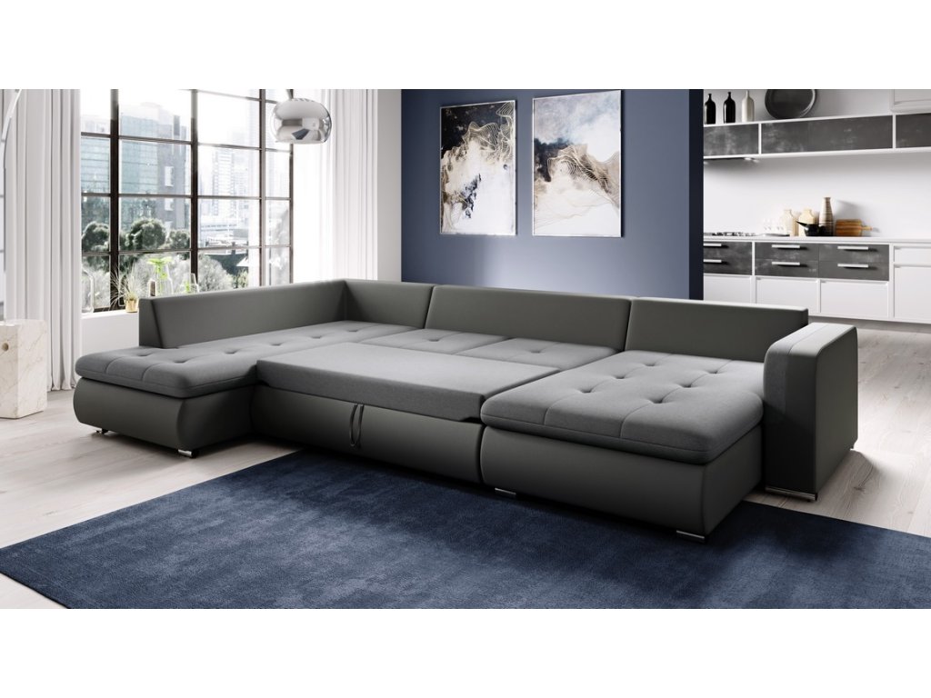 Praktická prostorná celočalouněná rohová sedačka do tvaru U. Netradiční a velmi moderní vzhled. Sedačka obsahuje prostor na příležitostní spaní. Po rozložení je spací plocha 285 x 135 cm. Rozklad je snadný, vysune se vozík s matrací do přední části. Pohodlné sezení zaručují vlnovcové pružiny spolu s PUR pěnou ( T30 ). Výška sedu je 41 cm, hloubka sedu 48 cm ( bez polštářů 63 cm ), výška sedačky bez polštářů 65 cm. Nožky jsou kovové pochromované. Barevné provedení - korpus ekokůže Madryt 195, sedací a opěrná část látka Metro 90 a dekorační polštářky Metro 90.Doplňkové parametry