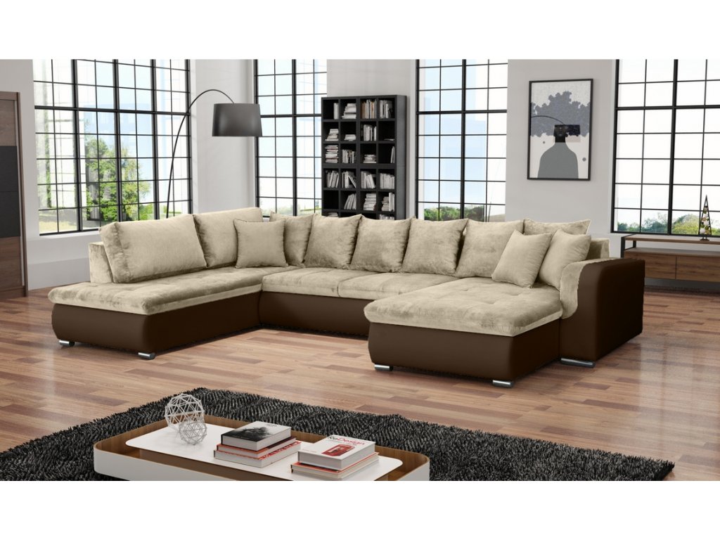 Praktická prostorná celočalouněná rohová sedačka do tvaru U. Netradiční a velmi moderní vzhled. Sedačka obsahuje prostor na příležitostní spaní. Po rozložení je spací plocha 285 x 135 cm. Rozklad je snadný, vysune se vozík s matrací do přední části. Pohodlné sezení zaručují vlnovcové pružiny spolu s PUR pěnou ( T30 ). Výška sedu je 41 cm, hloubka sedu 48 cm ( bez polštářů 63 cm ), výška sedačky bez polštářů 65 cm. Nožky jsou kovové pochromované. Barevné provedení - korpus ekokůže Madryt 128, sedací a opěrná část látka Orinoco 23 a dekorační polštářky Orinoco 23.Doplňkové parametry