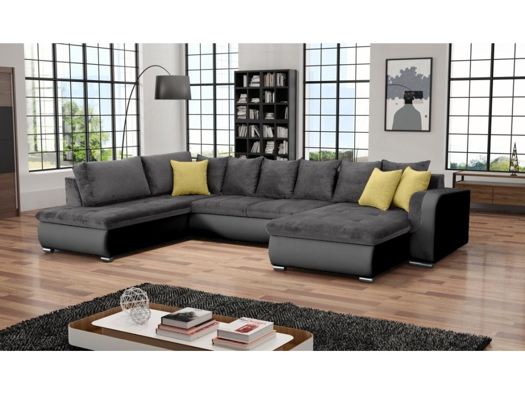 Praktická prostorná celočalouněná rohová sedačka do tvaru U. Netradiční a velmi moderní vzhled. Sedačka obsahuje prostor na příležitostní spaní. Po rozložení je spací plocha 285 x 135 cm. Rozklad je snadný, vysune se vozík s matrací do přední části. Pohodlné sezení zaručují vlnovcové pružiny spolu s PUR pěnou ( T30 ). Výška sedu je 41 cm, hloubka sedu 48 cm ( bez polštářů 63 cm ), výška sedačky bez polštářů 65 cm. Nožky jsou kovové pochromované. Barevné provedení - korpus ekokůže Madryt 1100, sedací a opěrná část látka Orinoco 96 a dekorační polštářky Orinoko 40.Doplňkové parametry