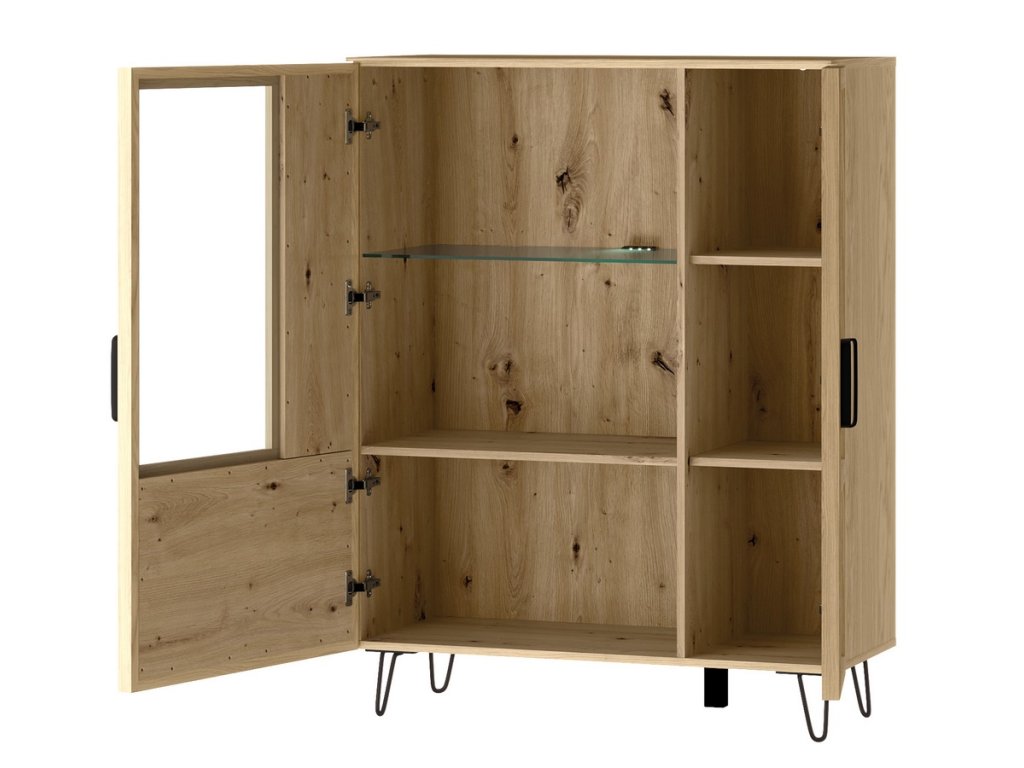 Obývací sestava v nadčasovém provedení. Korpus je vyroben z přírodní dýhy v barvě dub artisan, dvířka jsou vyrobeny z masivu v provedení dub artisan olejovaný. Sestava se skládá z těchto položek (Š x V x H cm) - vitrína nízká (95 x 124 x 42 cm), závěsná police (120 x 21 x 21 cm) a komoda (140 x 89 x 42 cm). Součástí vitríny je také LED osvětlení. Úchyty a nožky jsou kovové v barvě černá mat. Dvířka disponují systémem tichého dovírání. Dodáváme již ve smontovaném stavu.Doplňkové parametry