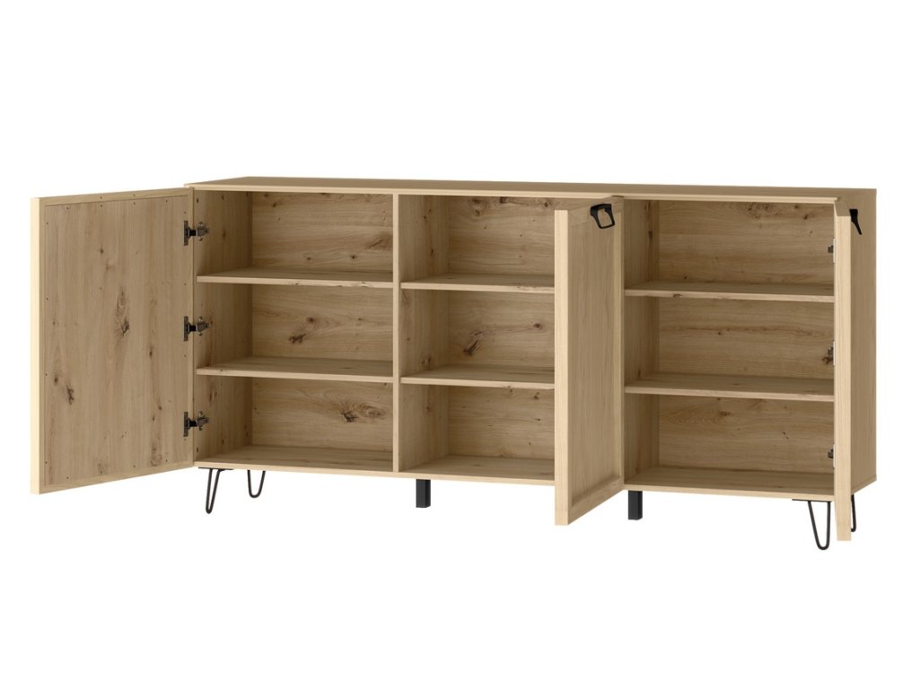 Komoda třídveřová v nadčasovém provedení. Korpus je vyroben z přírodní dýhy v barvě dub artisan, dvířka jsou vyrobeny z masivu v provedení dub artisan olejovaný. Úchyty a nožky jsou kovové v barvě černá mat. Dvířka disponují systémem tichého dovírání. Dodáváme již ve smontovaném stavu.Doplňkové parametry