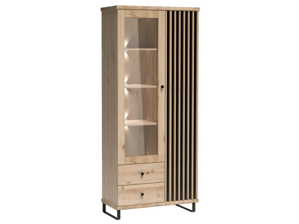 šířka: 86,4 cm | výška: 191 cm | hloubka: 40,6 cm Vitrína dvoudveřová se dvěma zásuvkami s netradičním provedením detailu dvířek s lamelami. Kolekce nábytku v sobě spojuje...