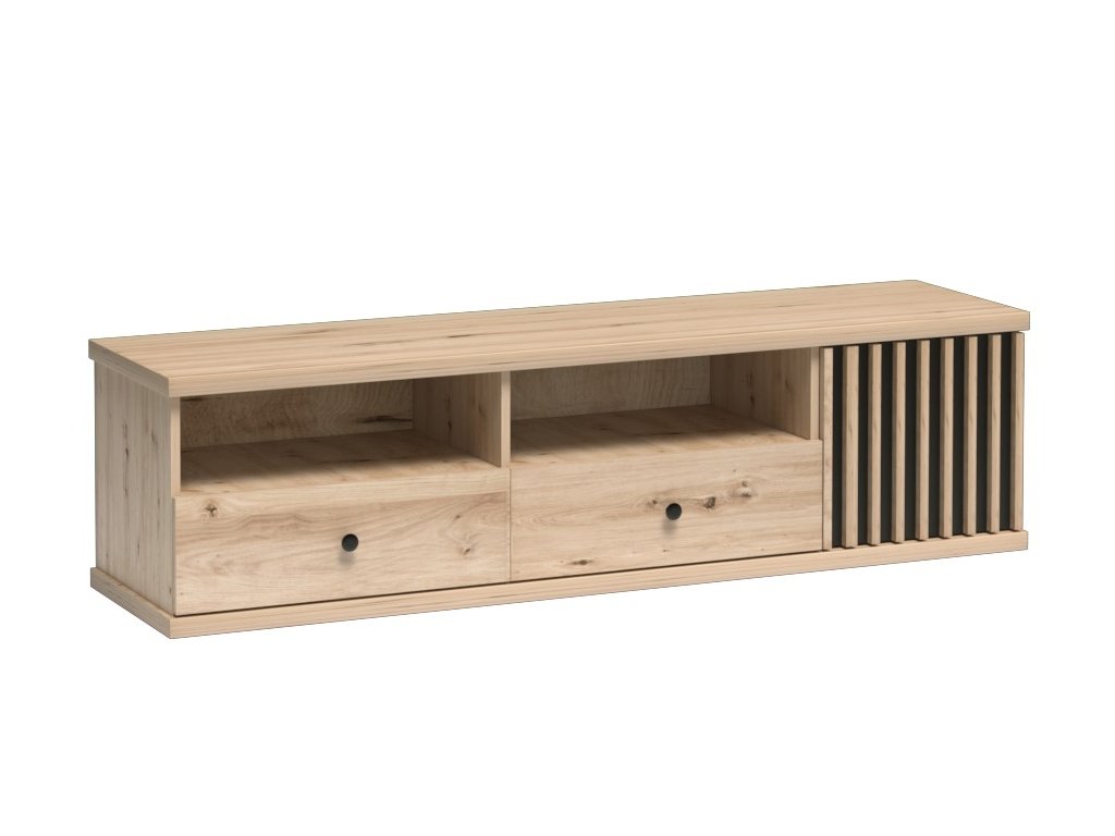 Obývací sestava s netradičním provedením detailu dvířek s lamelami. Kolekce nábytku v sobě spojuje jednoduchost, originální vzhled a funkčnost. Barevné provedení je v kombinaci dub artisan/černá mat. Sestava se skládá z těchto položek (Š x V x H cm) - vitrína dvoudveřová se zásuvkami (86,4 x 191 x 40,6 cm), televizní stolek (160,6 x 43,4 x 40,6 cm a závěsný panel (80 x 138 x 3,2 cm). Nábytek je vyroben z kvalitního lamina ohraničeného ABS páskou, dekorační lamely jsou vyrobeny z desky MDF. Zásuvky jsou vybaveny kovovými pojezdy se systémem tichého dovírání. Kolekce se skládá z mnoha prvků a tento široký výběr Vám zaručí sestavit si nábytek podle svých vlastních představ a přání. Možnost dokoupení LED osvětlení. Dodáváme v demontovaném stavu.Doplňkové parametry