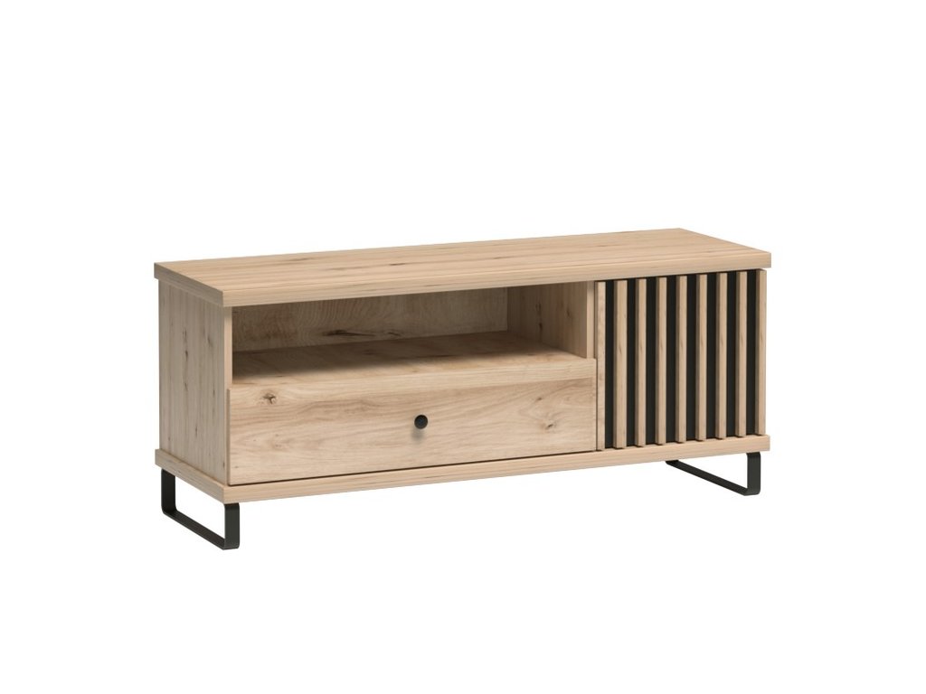 Televizní stolek jednodveřový se zásuvkou s netradičním provedením detailu dvířek s lamelami. Kolekce nábytku v sobě spojuje jednoduchost, originální vzhled a funkčnost. Barevné provedení je v kombinaci dub artisan/černá mat. Nábytek je vyroben z kvalitního lamina ohraničeného ABS páskou, dekorační lamely jsou vyrobeny z desky MDF. Zásuvka je vybavena kovovými pojezdy se systémem tichého dovírání. Kolekce se skládá z mnoha prvků a tento široký výběr Vám zaručí sestavit si nábytek podle svých vlastních představ a přání. Dodáváme v demontovaném stavu.Doplňkové parametry