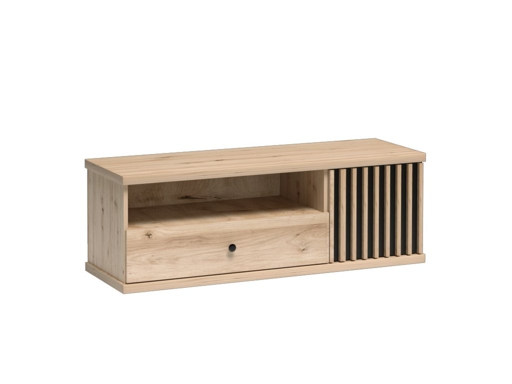 Televizní stolek jednodveřový se zásuvkou s netradičním provedením detailu dvířek s lamelami. Kolekce nábytku v sobě spojuje jednoduchost, originální vzhled a funkčnost. Barevné provedení je v kombinaci dub artisan/černá mat. Nábytek je vyroben z kvalitního lamina ohraničeného ABS páskou, dekorační lamely jsou vyrobeny z desky MDF. Zásuvka je vybavena kovovými pojezdy se systémem tichého dovírání. Stolek je doplněn kovovými nohami v černé barvě. Kolekce se skládá z mnoha prvků a tento široký výběr Vám zaručí sestavit si nábytek podle svých vlastních představ a přání. Dodáváme v demontovaném stavu.Doplňkové parametry