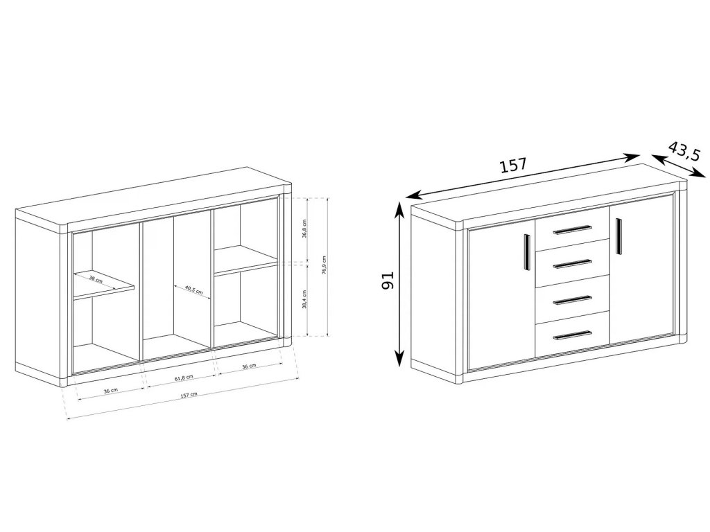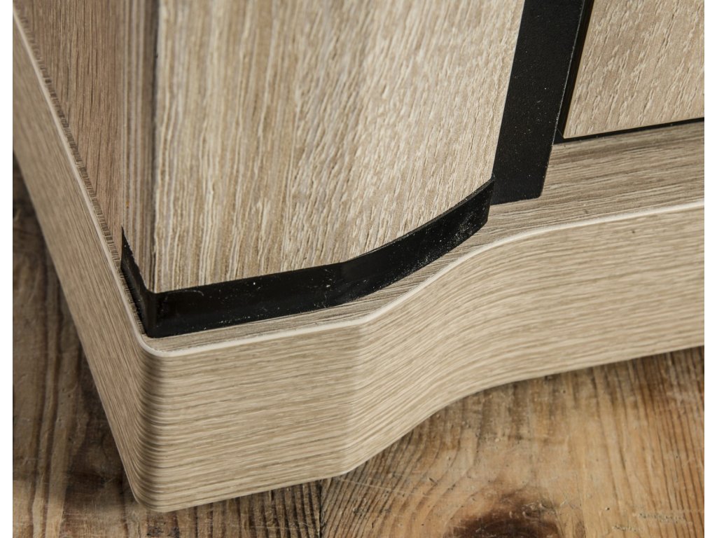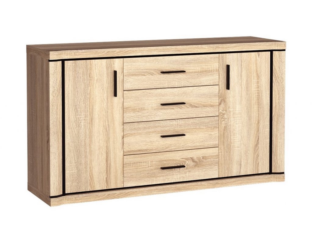 Komoda ze sektorové řady je kombinovaná, má ve středu čtyři zásuvky a po stranách jedny dvířka, za kterými je jedna polička. Má zajímavé provedení v podobě netradičně vyřezávaných vrchních a spodních desek. Systém je exkluzivní kolekce navržena v moderním duchu. Celá řada se vyznačuje masivním vzhledem a jednoduchými tvary. Nábytek je vyroben z kvalitního LTD s lištami z MDF, součástí nábytku jsou desky 48 mm, vše opatřeno ABS páskou. Barevné provedení - dub sonoma. Sektor má široký výběr komponentů, díky kterým lze vybavit nejen obývací pokoj, ale i jídelnu, kancelář nebo ložnici. Dodáváme v demontovaném stavu.Doplňkové parametry