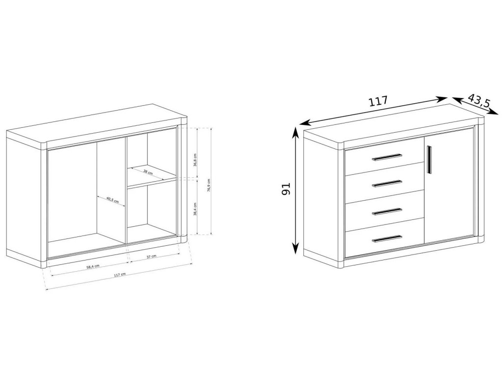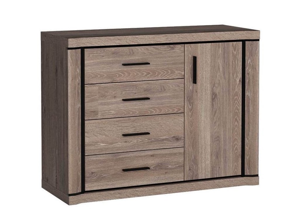 Komoda ze sektorové řady je kombinovaná, má čtyři zásuvky a jedny dvířka. Má zajímavé provedení v podobě netradičně vyřezávaných vrchních a spodních desek. Systém je exkluzivní kolekce navržena v moderním duchu. Celá řada se vyznačuje masivním vzhledem a jednoduchými tvary. Nábytek je vyroben z kvalitního LTD s lištami z MDF, součástí nábytku jsou desky 48 mm, vše opatřeno ABS páskou. Nabízíme barvu - dub lanýž. Má široký výběr komponentů, díky kterým lze vybavit nejen obývací pokoj, ale i jídelnu, kancelář nebo ložnici. Dodáváme v demontovaném stavu.Doplňkové parametry