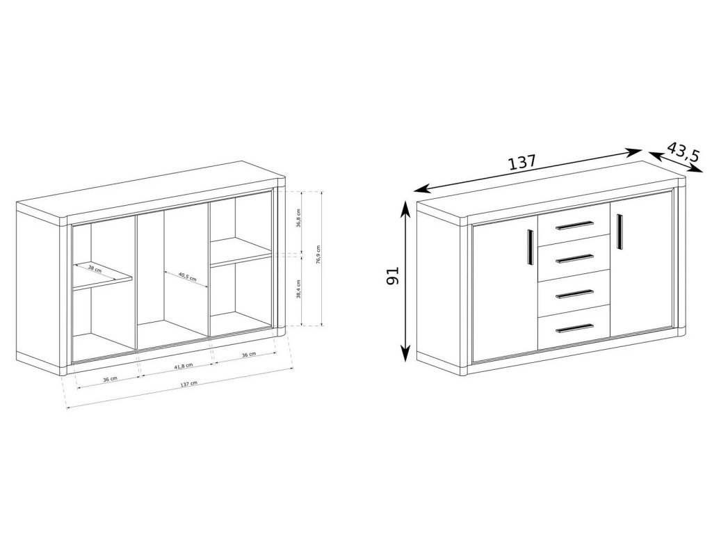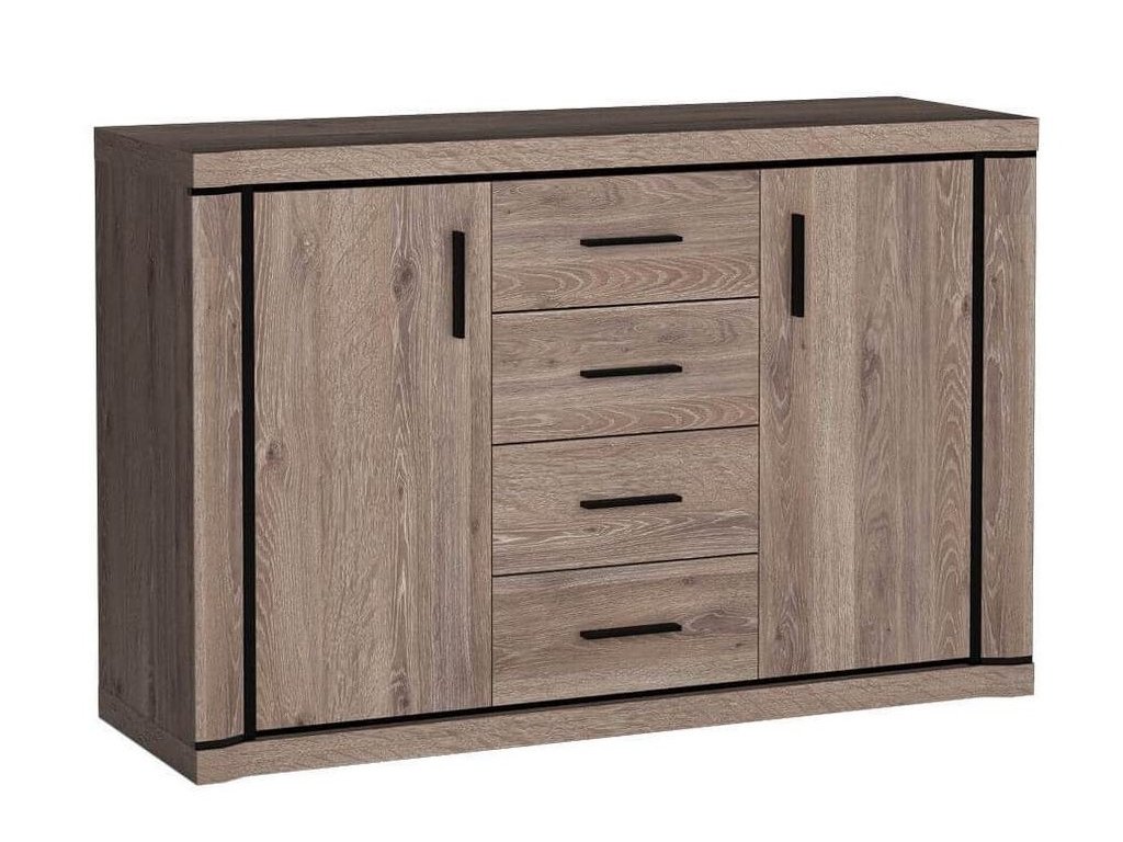 Komoda ze sektorové řady je kombinovaná, má ve středu čtyři zásuvky a po stranách jedny dvířka za kterými je jedna polička. Má zajímavé provedení v podobě netradičně vyřezávaných vrchních a spodních desek. Systém je exkluzivní kolekce navržena v moderním duchu. Celá řada se vyznačuje masivním vzhledem a jednoduchými tvary. Nábytek je vyroben z kvalitního LTD s lištami z MDF, součástí nábytku jsou desky 48 mm, vše opatřeno ABS páskou. Barevné provedení - dub lanýž. Má široký výběr komponentů, díky kterým lze vybavit nejen obývací pokoj, ale i jídelnu, kancelář nebo ložnici. Dodáváme v demontovaném stavu.Doplňkové parametry