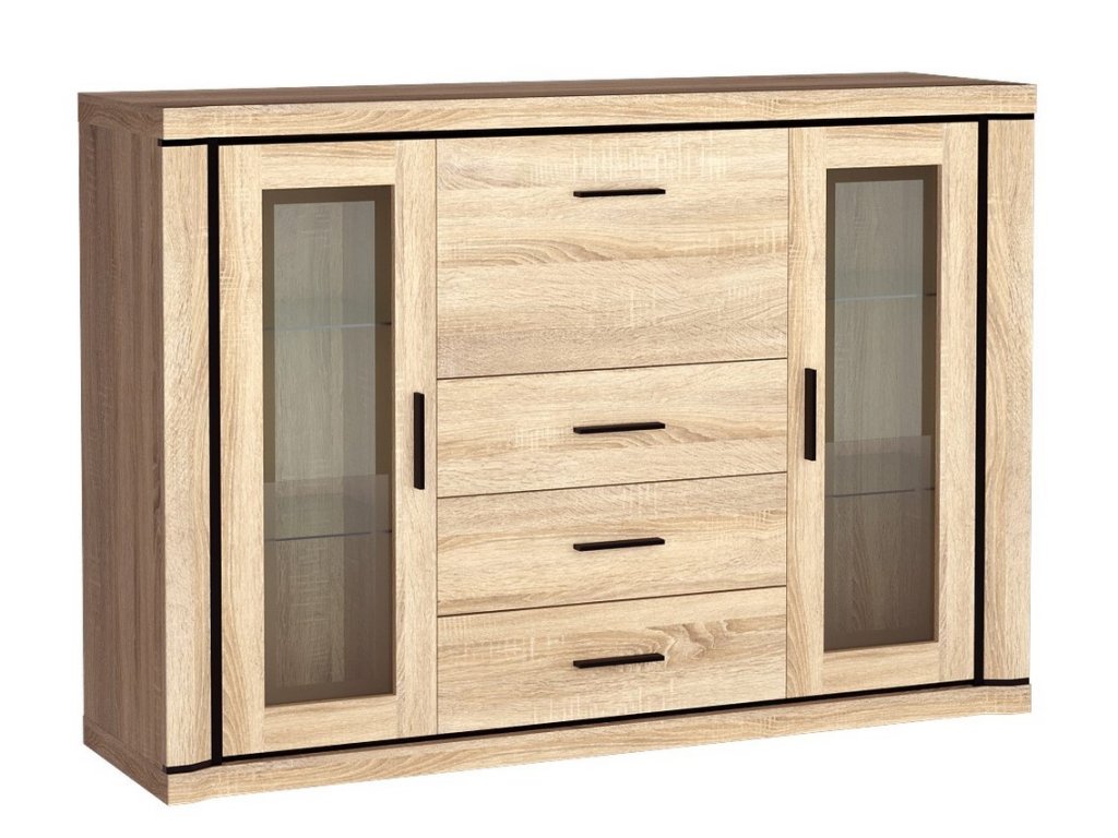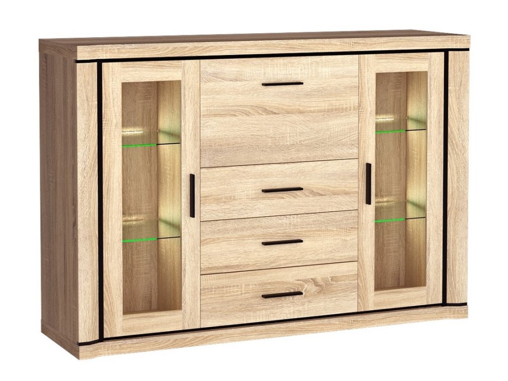 Vitrínová komoda ze sektorové řady je kombinovaná, má ve středu tři zásuvky a výklopné dvířka, po stranách jedny prosklené dvířka, za kterými jsou dvě skleněné poličky. Má zajímavé provedení v podobě netradičně vyřezávaných vrchních a spodních desek. Systém je exkluzivní kolekce navržena v moderním duchu. Celá řada se vyznačuje masivním vzhledem a jednoduchými tvary. Nábytek je vyroben z kvalitního LTD s lištami z MDF, součástí nábytku jsou desky 48 mm, vše opatřeno ABS páskou. Barevné provedení - dub sonoma. Má široký výběr komponentů, díky kterým lze vybavit nejen obývací pokoj, ale i jídelnu, kancelář nebo ložnici. Možnost dokoupit LED osvětlení. Dodáváme v demontovaném stavu.Doplňkové parametry